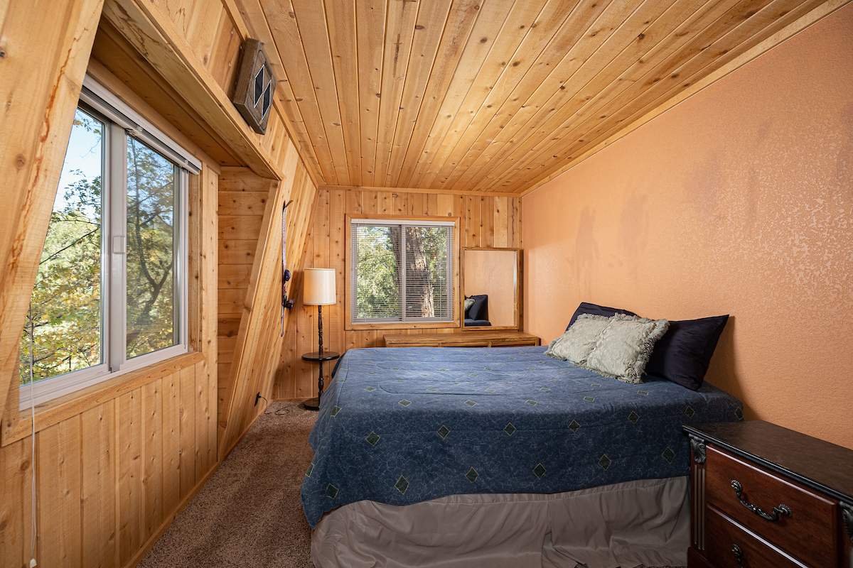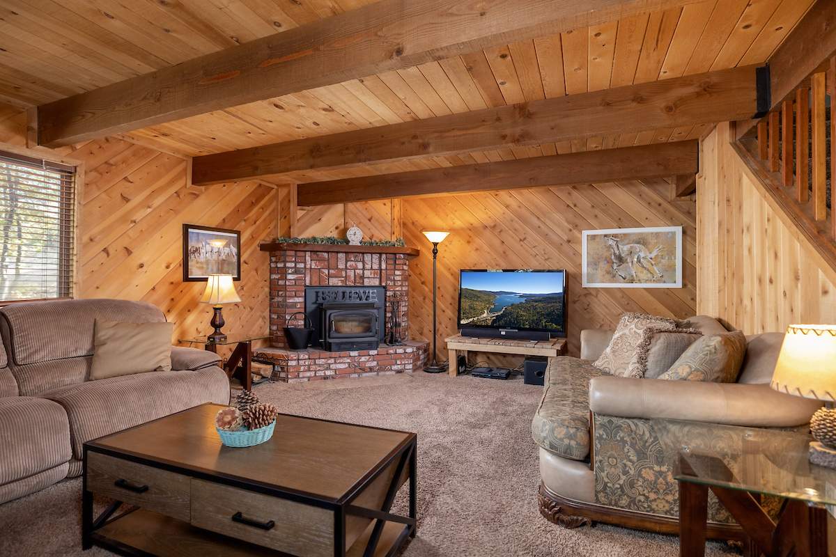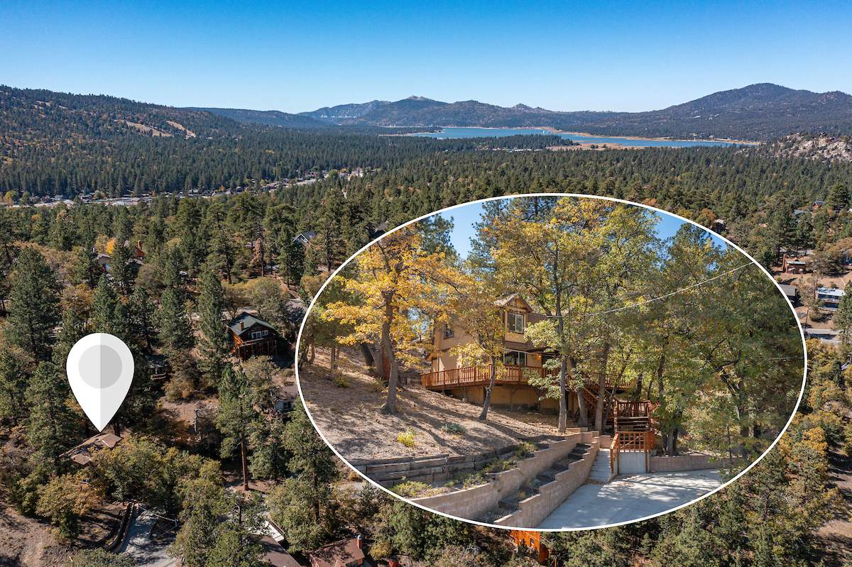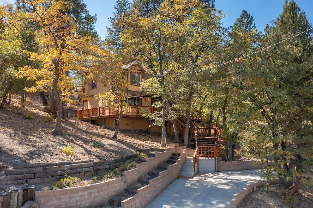 Nestled in the oaks and pines in a sought-after Moonridge location near Bear Mountain, the lake, forest and everything else Big Bear has to offer. This tree house has room for a crowd with 5 bedrooms, 2 full baths, and laundry. Classic gambrel-style has that true mountain cabin feel with beamed ceilings and lots of wood T&G. Cozy brick fireplace with efficient wood-burning stove will warm you right up after a long day on the slopes. Kitchen features custom cabinetry, a dining area and pantry. Enjoy the treed surroundings out on the wraparound deck and gaze at the stars while soaking in the private spa. Capable of accommodating a large family or group, this home will make an awesome weekend getaway and/or income-producing vacation rental investment.