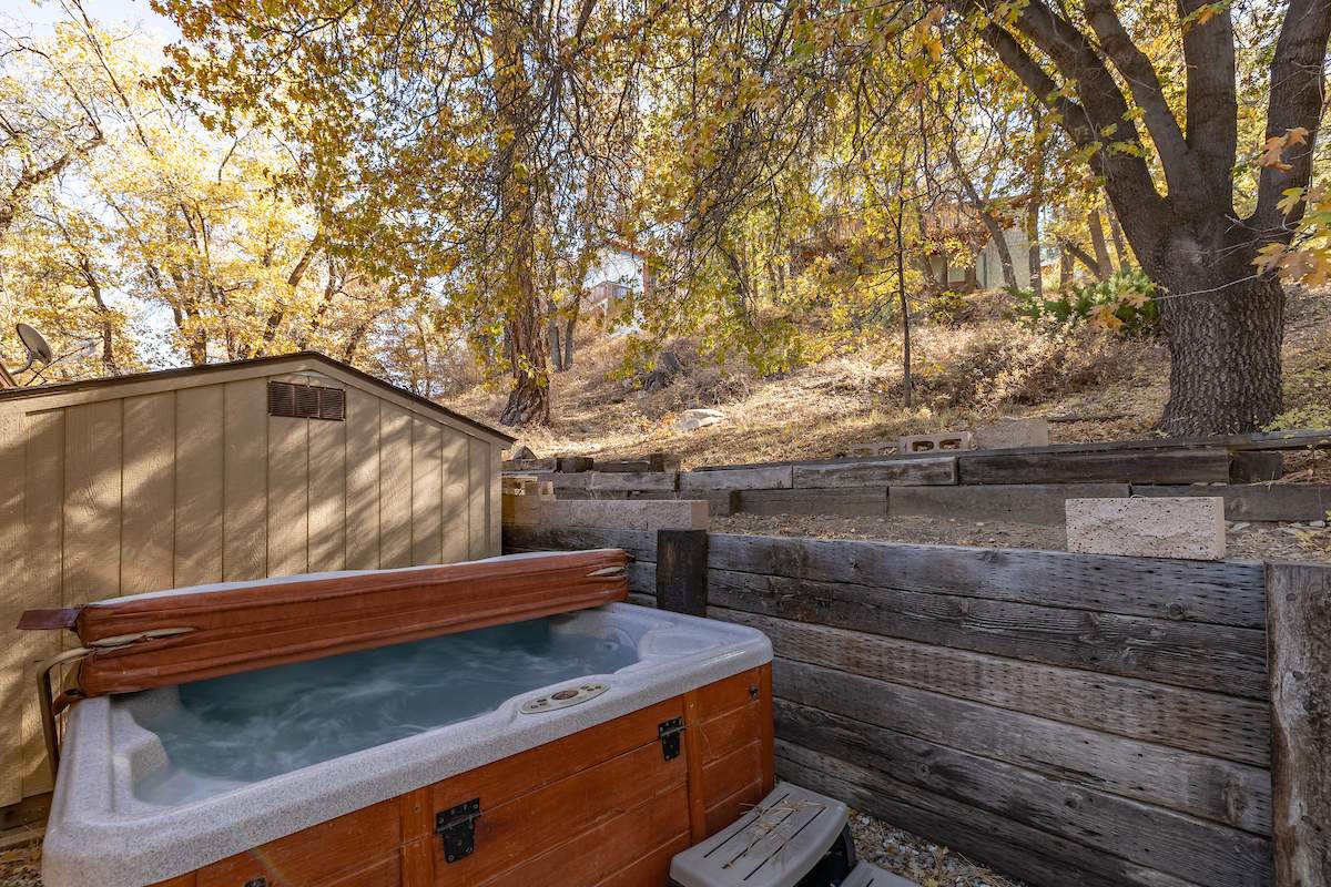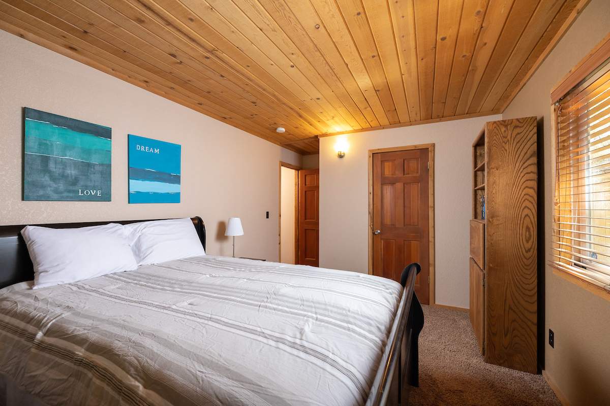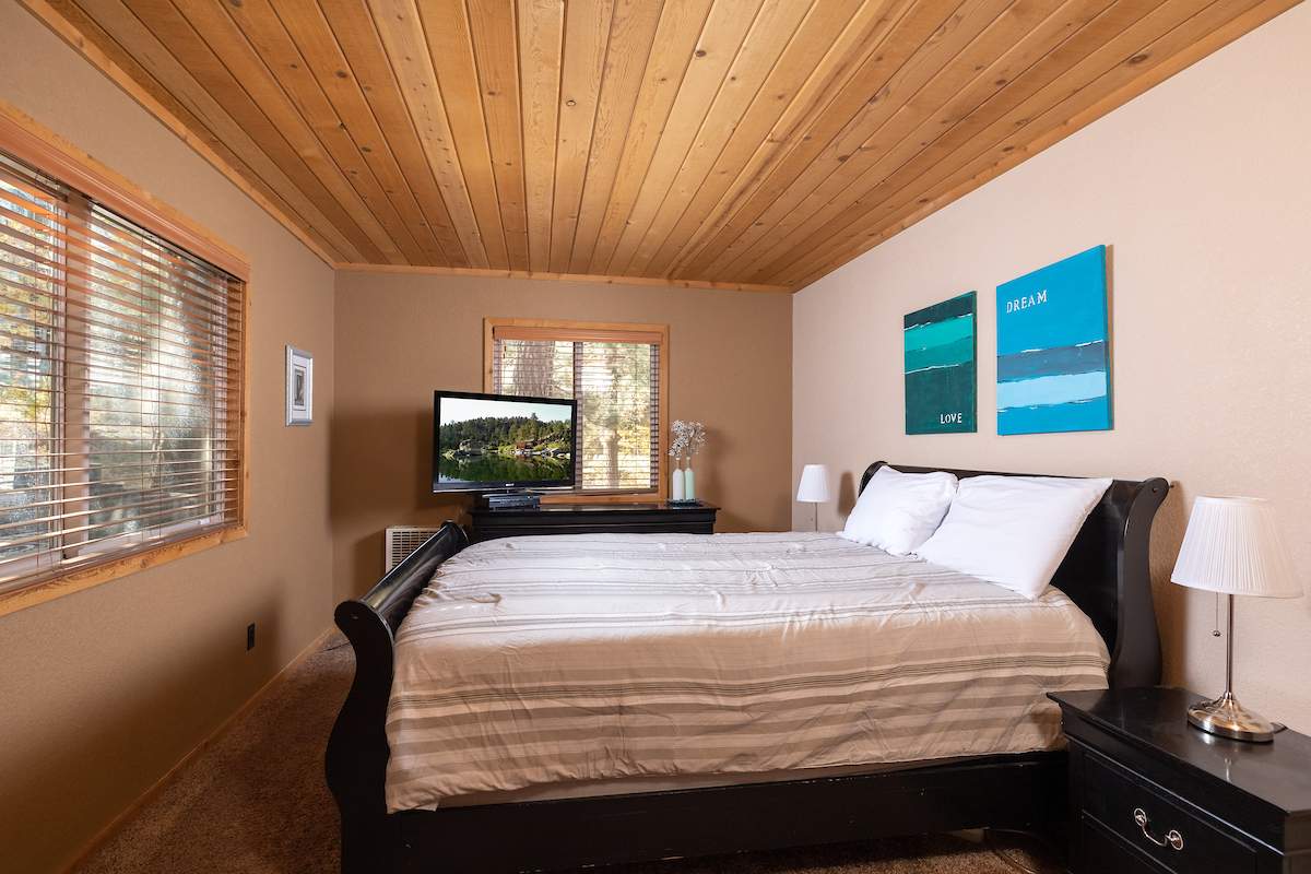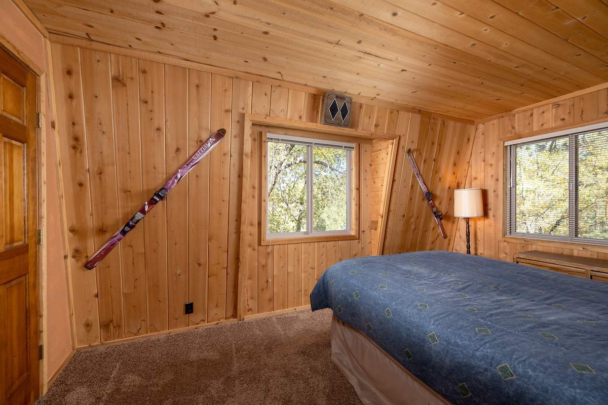 Nestled in the oaks and pines in a sought-after Moonridge location near Bear Mountain, the lake, forest and everything else Big Bear has to offer. This tree house has room for a crowd with 5 bedrooms, 2 full baths, and laundry. Classic gambrel-style has that true mountain cabin feel with beamed ceilings and lots of wood T&G. Cozy brick fireplace with efficient wood-burning stove will warm you right up after a long day on the slopes. Kitchen features custom cabinetry, a dining area and pantry. Enjoy the treed surroundings out on the wraparound deck and gaze at the stars while soaking in the private spa. Capable of accommodating a large family or group, this home will make an awesome weekend getaway and/or income-producing vacation rental investment.
