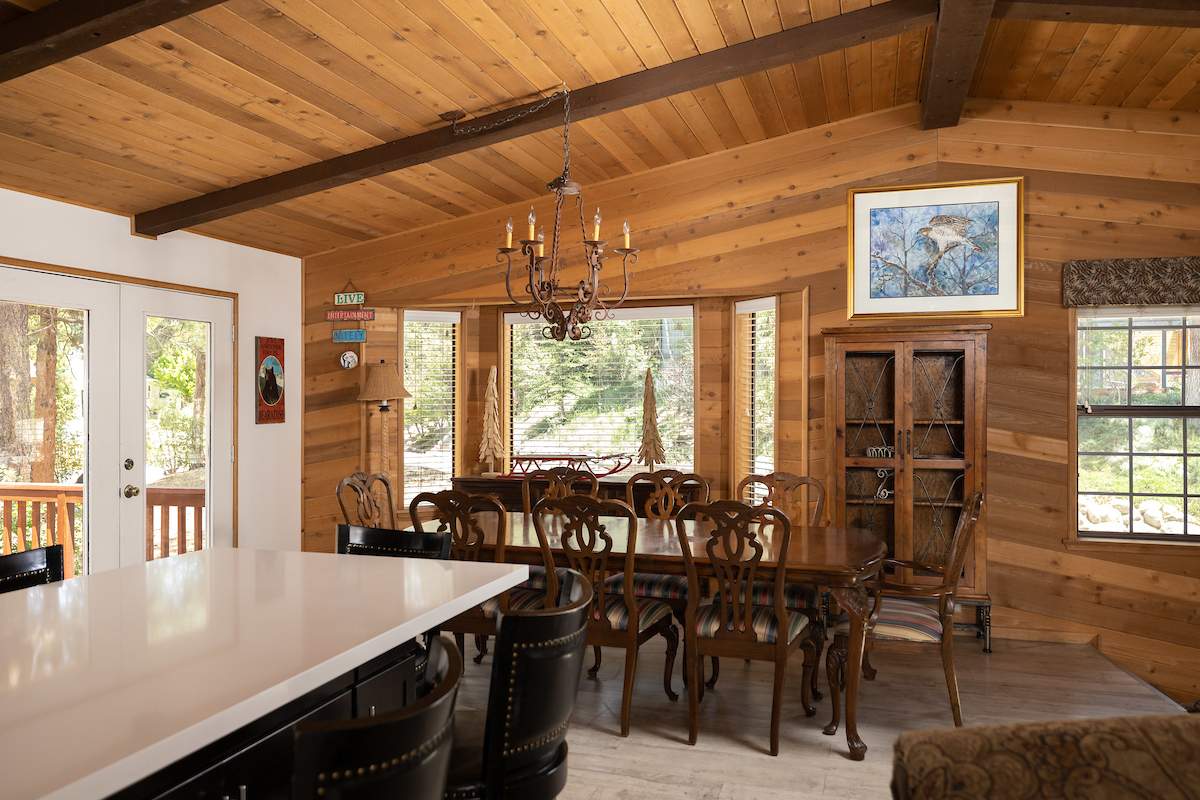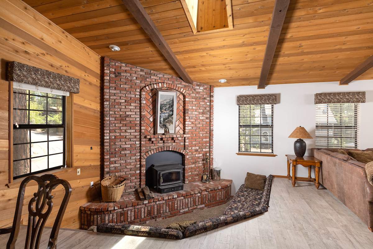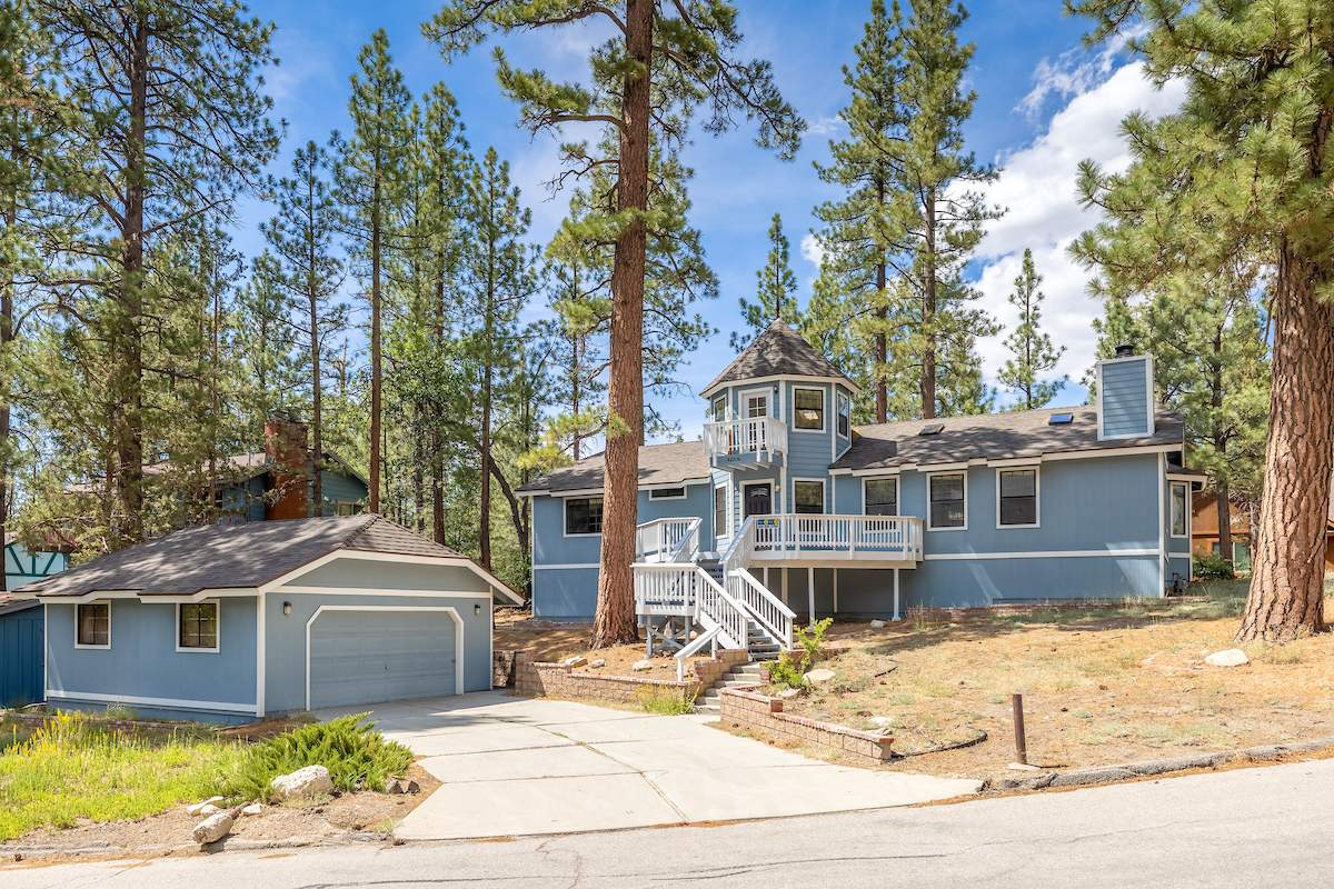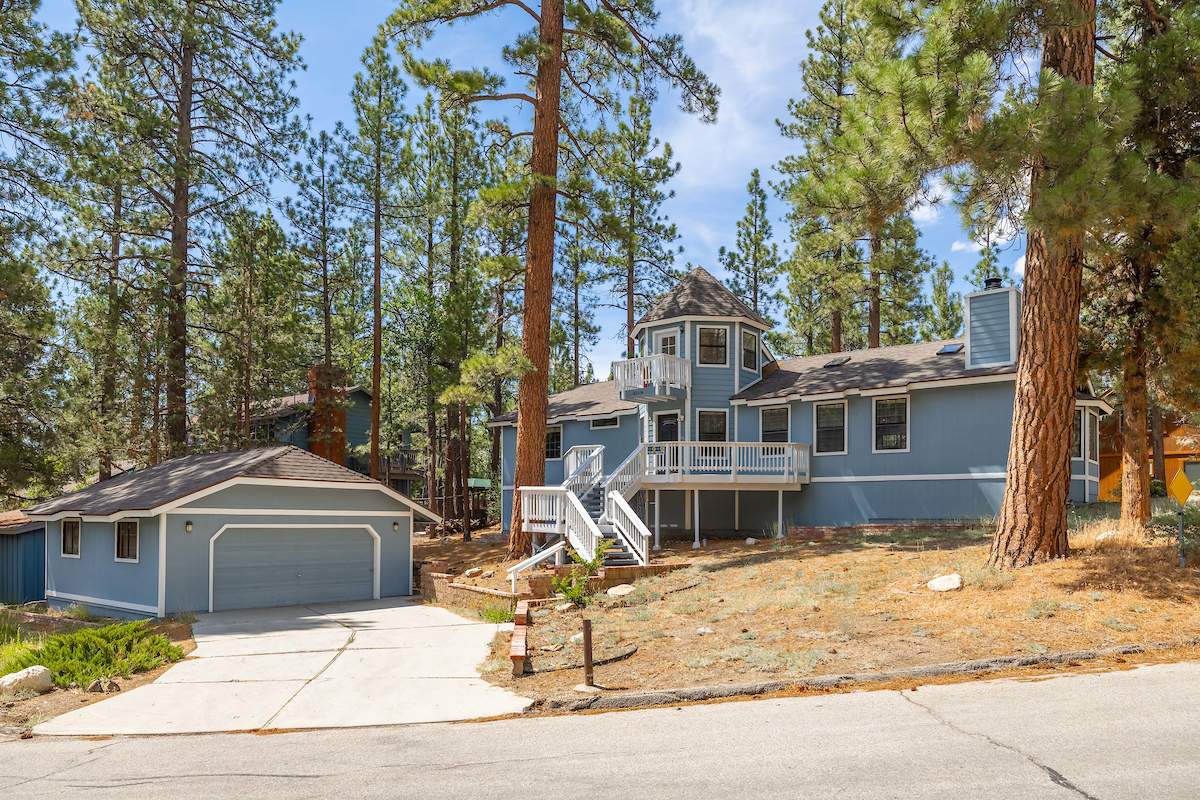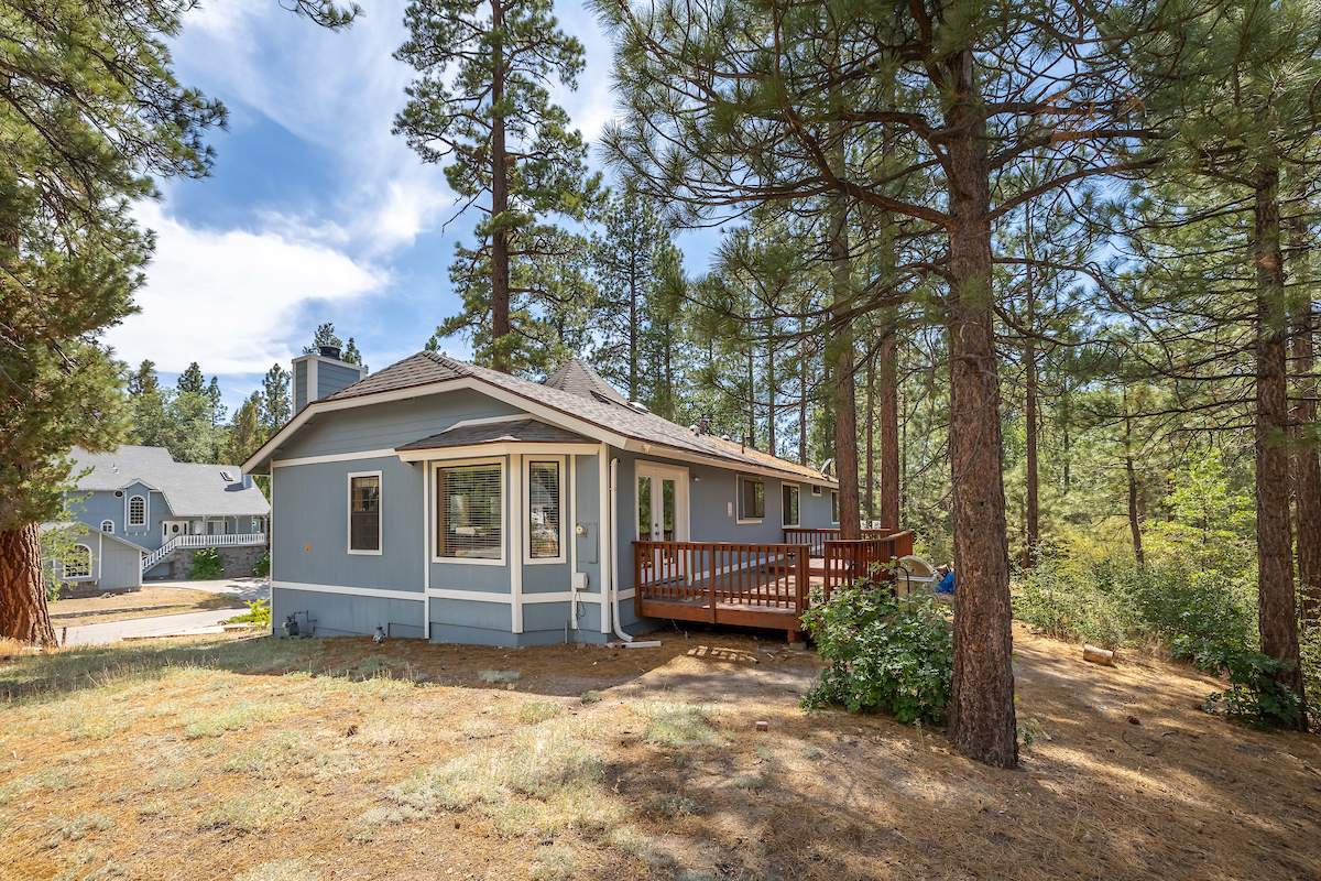 Stellar location for this updated Fox Farm home in Alpine Woods Estates. Situated above street level on nearly a 1/3 acre corner lot with detached 2-car garage. Great room open concept floor plan, beamed ceilings with recessed lighting and skylights, laminate flooring, impressive brick fireplace with sunken seating area. Remodeled kitchen features a large island, plenty of counter top and storage space, stainless appliances; adjacent dining area w/bay windows. Gaze at the constellations while soaking in the spa, built into the back deck. All living areas, bedrooms, baths, etc., are on one level, with the exception of a “fox tower” turret accessed by a spiral staircase; could be used as an artist’s loft, study, office, or additional sleeping area; has it’s own balcony. Centrally located near all that beautiful Big Bear has to offer, furnished and turnkey, ready for you to start making your memories in the mountains today.