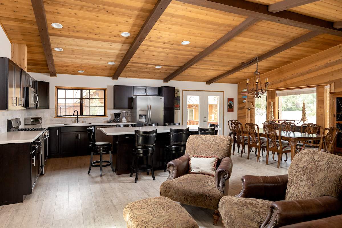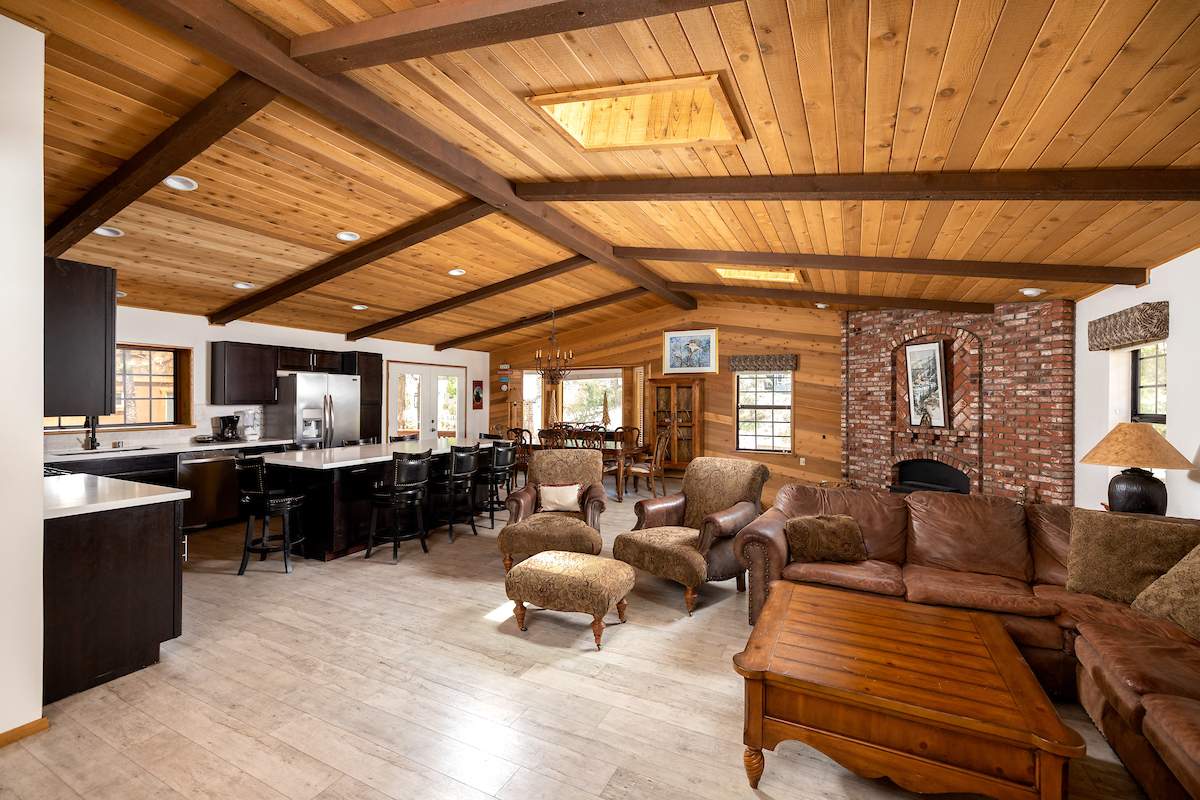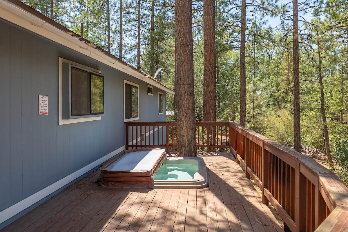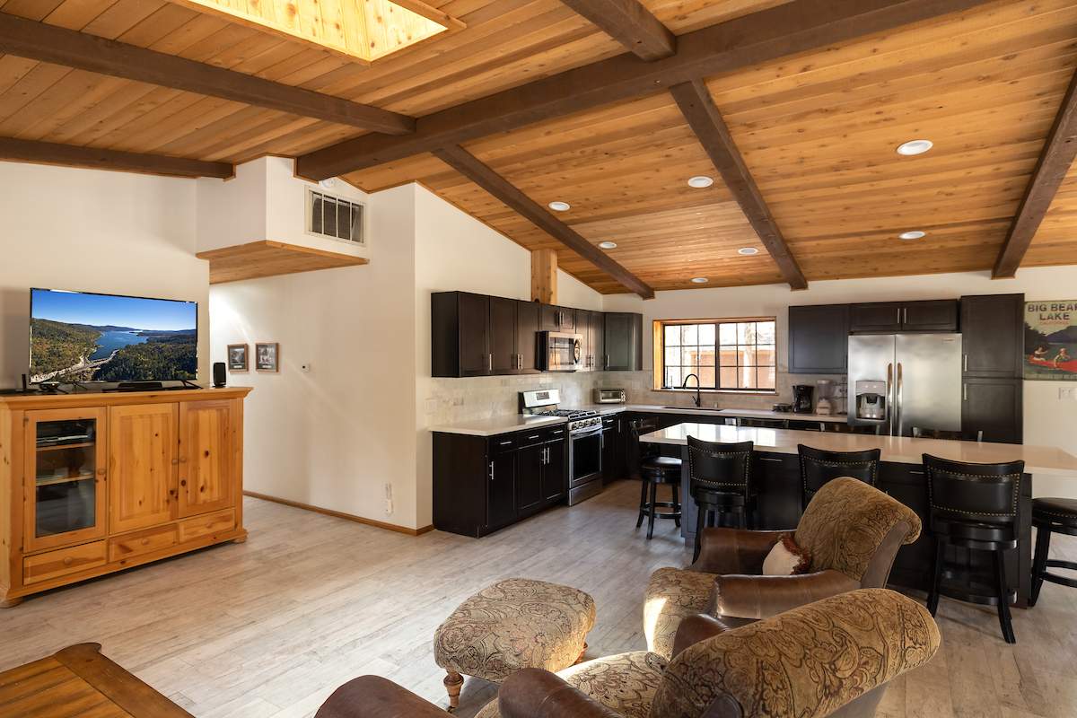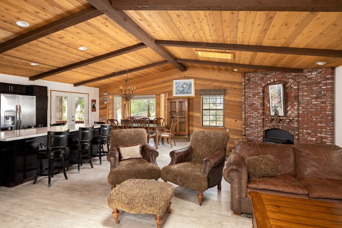 Stellar location for this updated Fox Farm home in Alpine Woods Estates. Situated above street level on nearly a 1/3 acre corner lot with detached 2-car garage. Great room open concept floor plan, beamed ceilings with recessed lighting and skylights, laminate flooring, impressive brick fireplace with sunken seating area. Remodeled kitchen features a large island, plenty of counter top and storage space, stainless appliances; adjacent dining area w/bay windows. Gaze at the constellations while soaking in the spa, built into the back deck. All living areas, bedrooms, baths, etc., are on one level, with the exception of a “fox tower” turret accessed by a spiral staircase; could be used as an artist’s loft, study, office, or additional sleeping area; has it’s own balcony. Centrally located near all that beautiful Big Bear has to offer, furnished and turnkey, ready for you to start making your memories in the mountains today.