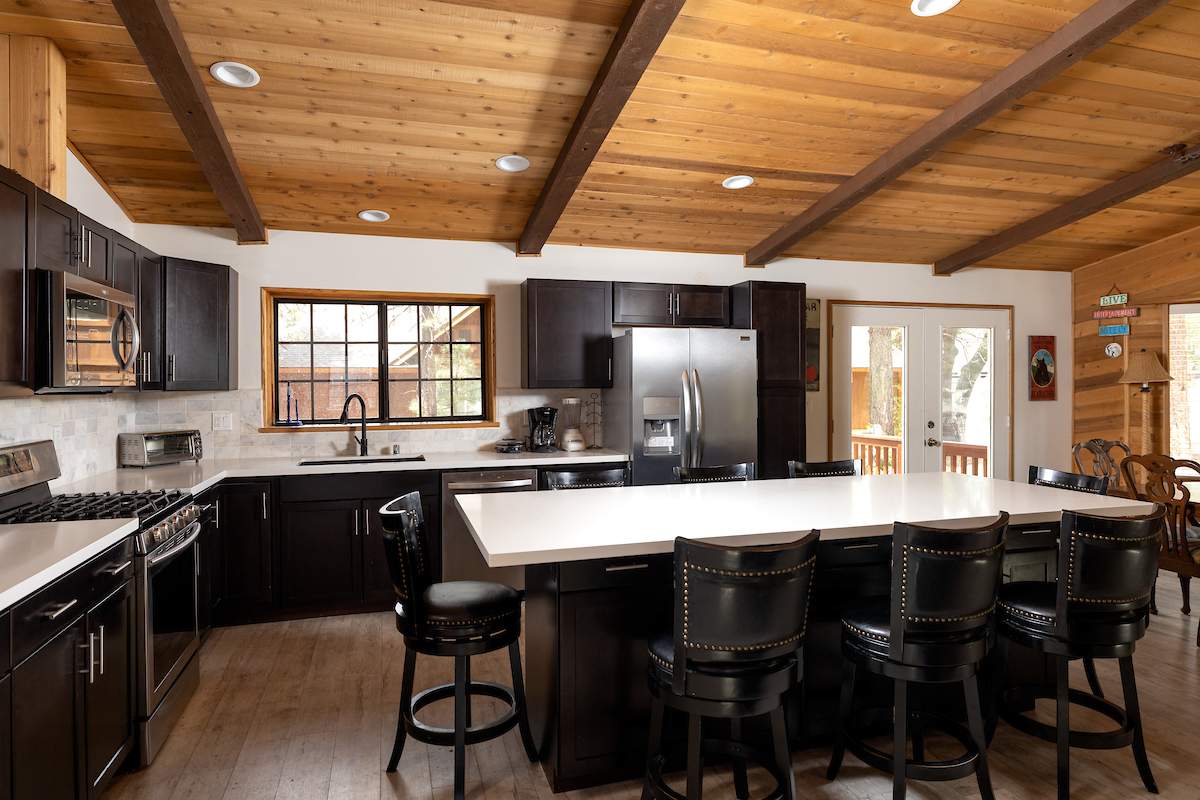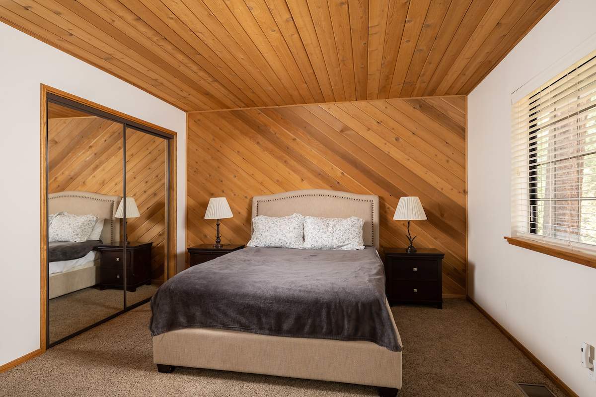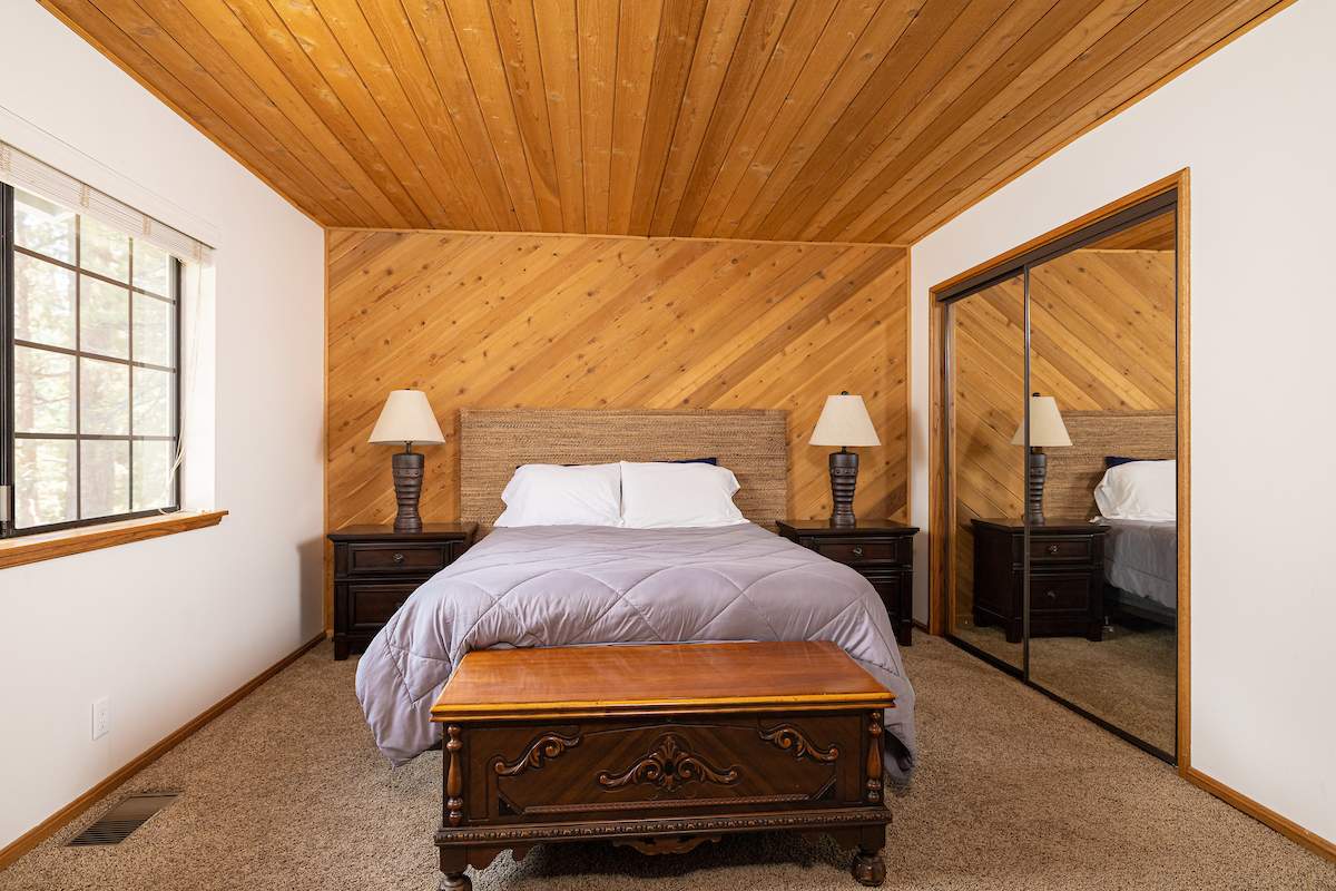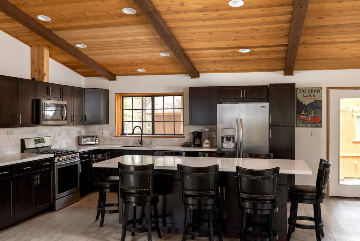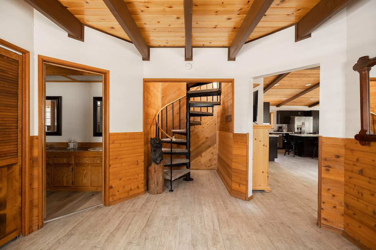 Stellar location for this updated Fox Farm home in Alpine Woods Estates. Situated above street level on nearly a 1/3 acre corner lot with detached 2-car garage. Great room open concept floor plan, beamed ceilings with recessed lighting and skylights, laminate flooring, impressive brick fireplace with sunken seating area. Remodeled kitchen features a large island, plenty of counter top and storage space, stainless appliances; adjacent dining area w/bay windows. Gaze at the constellations while soaking in the spa, built into the back deck. All living areas, bedrooms, baths, etc., are on one level, with the exception of a “fox tower” turret accessed by a spiral staircase; could be used as an artist’s loft, study, office, or additional sleeping area; has it’s own balcony. Centrally located near all that beautiful Big Bear has to offer, furnished and turnkey, ready for you to start making your memories in the mountains today.