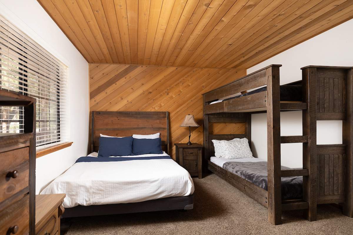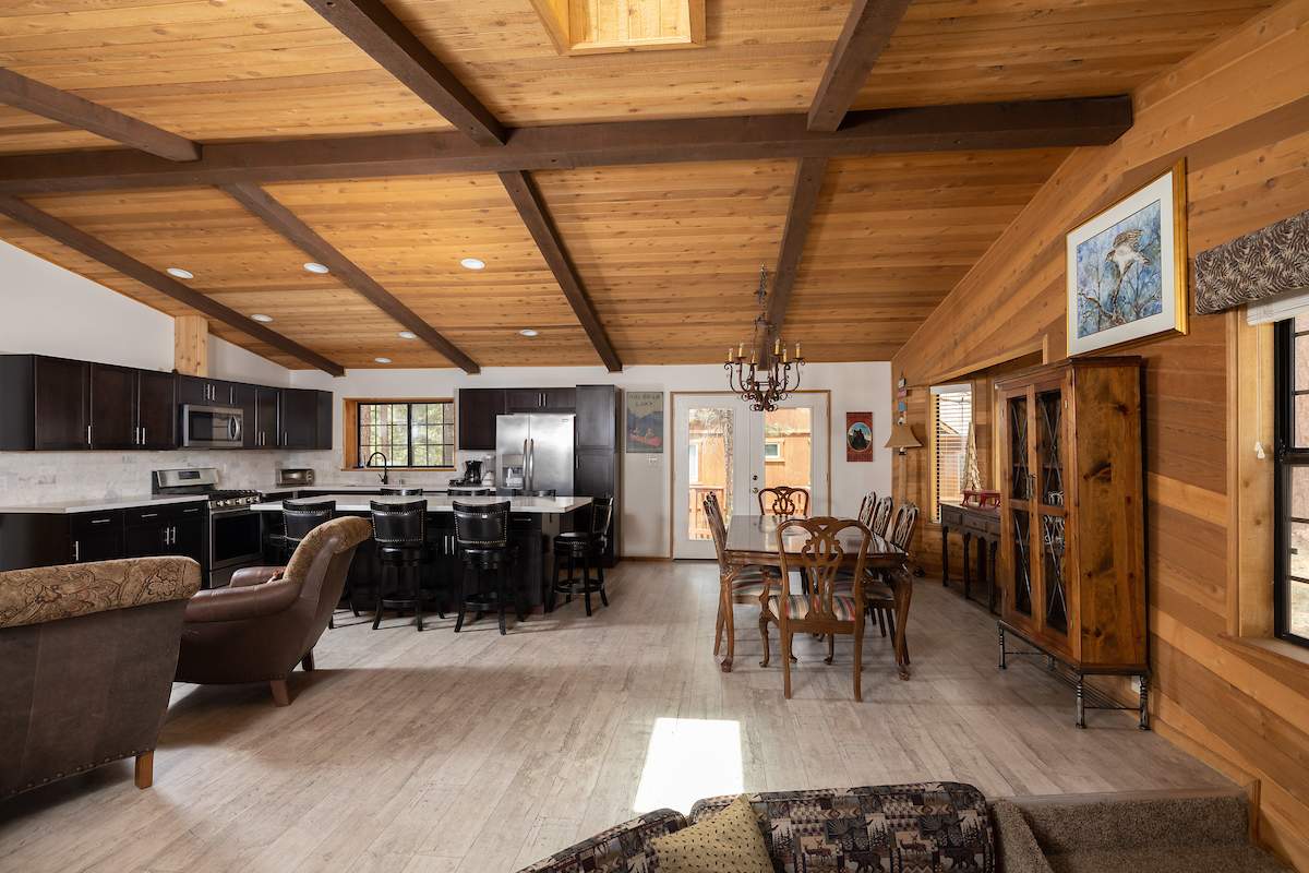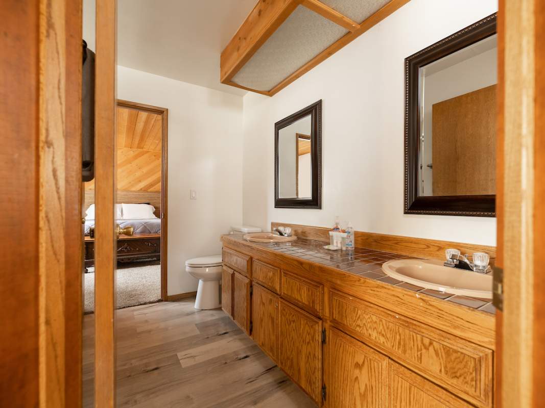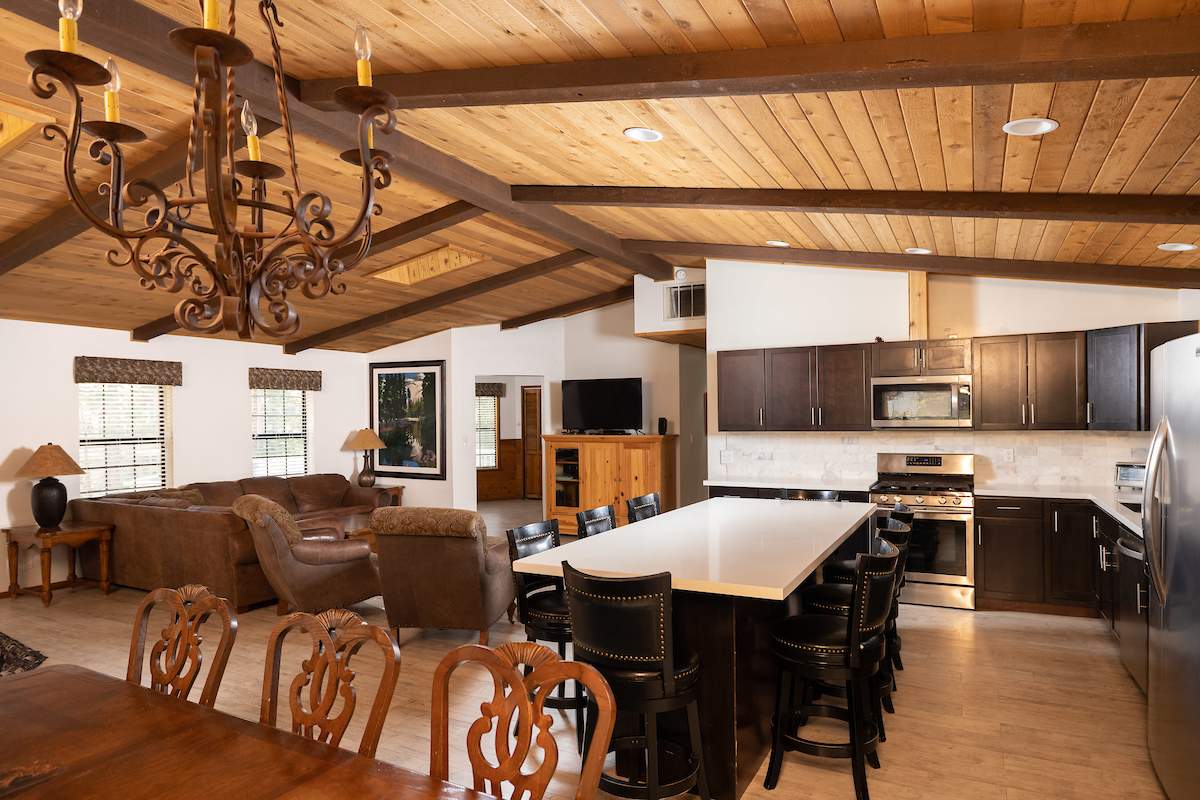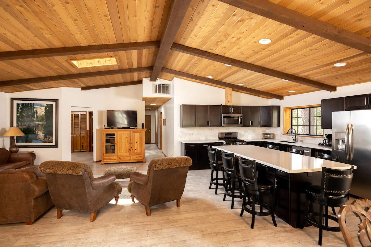 Stellar location for this updated Fox Farm home in Alpine Woods Estates. Situated above street level on nearly a 1/3 acre corner lot with detached 2-car garage. Great room open concept floor plan, beamed ceilings with recessed lighting and skylights, laminate flooring, impressive brick fireplace with sunken seating area. Remodeled kitchen features a large island, plenty of counter top and storage space, stainless appliances; adjacent dining area w/bay windows. Gaze at the constellations while soaking in the spa, built into the back deck. All living areas, bedrooms, baths, etc., are on one level, with the exception of a “fox tower” turret accessed by a spiral staircase; could be used as an artist’s loft, study, office, or additional sleeping area; has it’s own balcony. Centrally located near all that beautiful Big Bear has to offer, furnished and turnkey, ready for you to start making your memories in the mountains today.