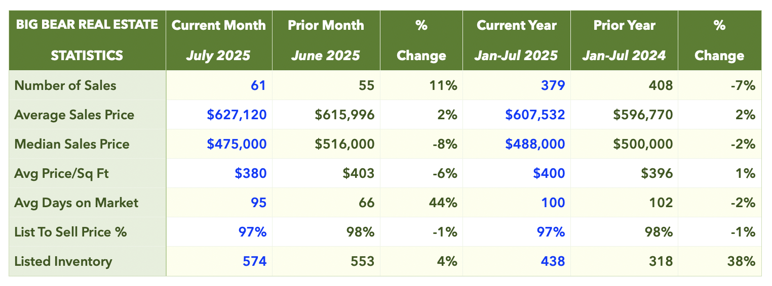 As we move through the heart of summer, the Big Bear real estate market continues to lean in favor of buyers. July brought more homes to the market, longer selling timelines, and a clear trend: properties are selling—but only when they’re priced right.