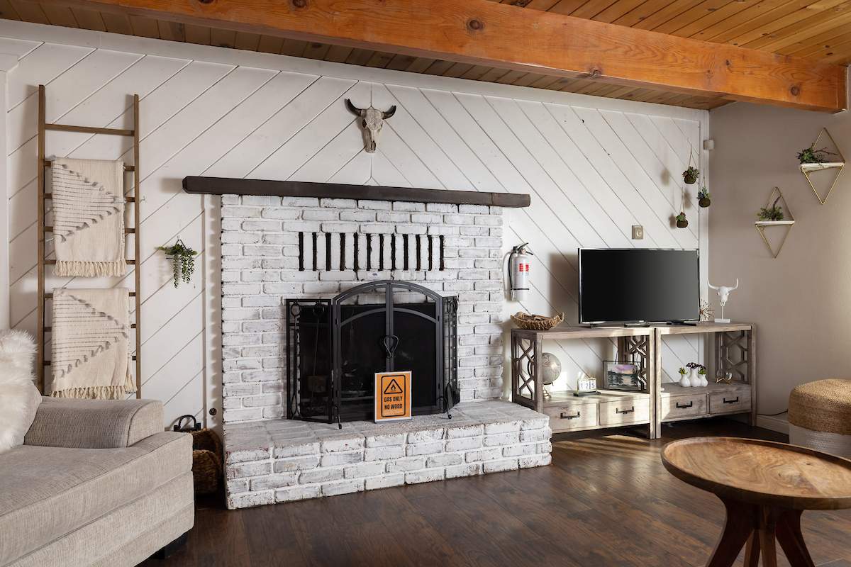 Tastefully updated gambrel-style cabin in upper Moonridge. Attractive wood laminate style flooring, brick fireplace, and beamed ceilings. Remodeled eat-in kitchen with stainless appliances and plenty of storage. Two spacious bedrooms with beamed ceilings and dormer windows. Remodeled bathroom features custom wood-look tile shower surround, wainscoting, and full size stacked laundry. High capacity tankless water heater. Gaze at the starry night sky from the spacious private fenced back yard. Easy year round access and plenty of parking and room to add a garage. High speed, high amperage electric car charger (40 amp 220V). Great location near ski slopes, forest, lake, and everything else Big Bear has to offer.