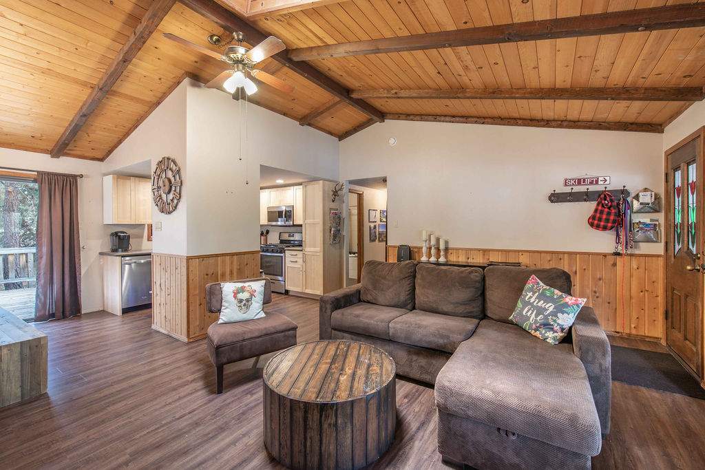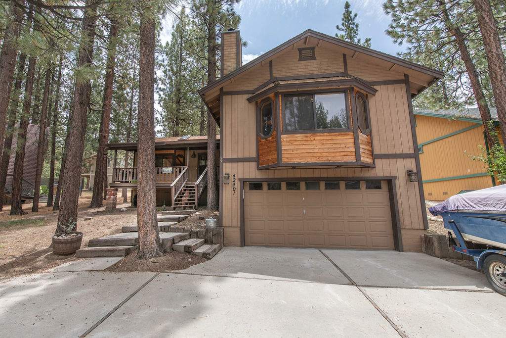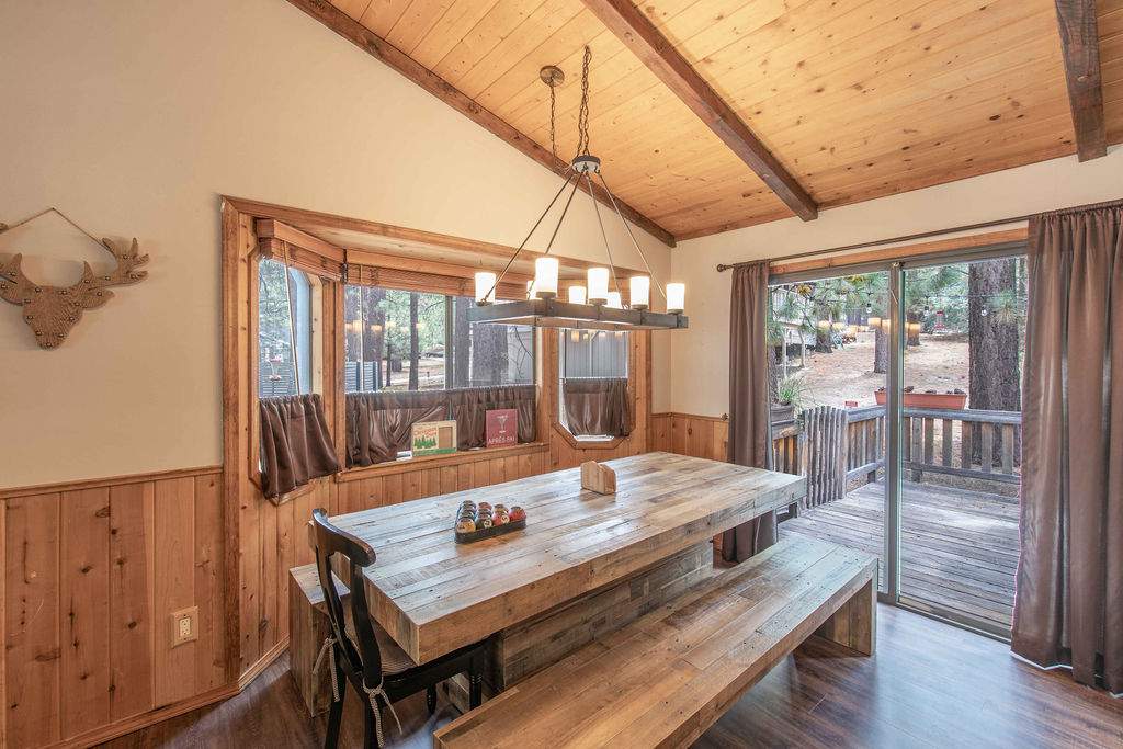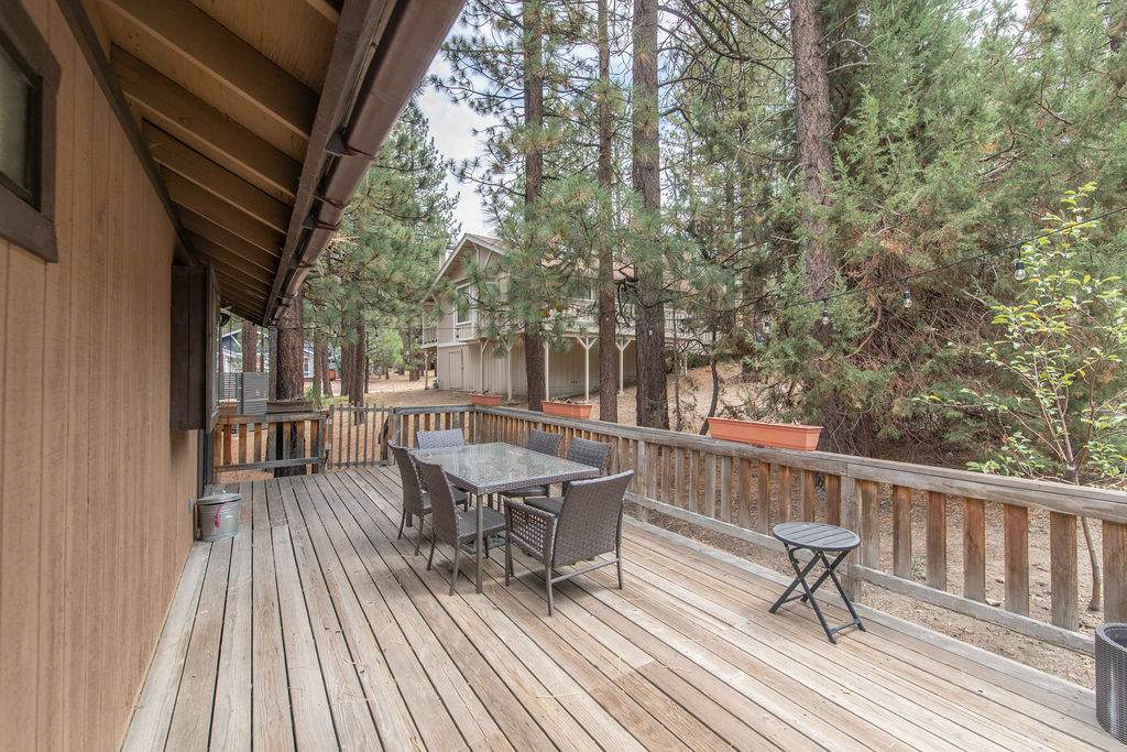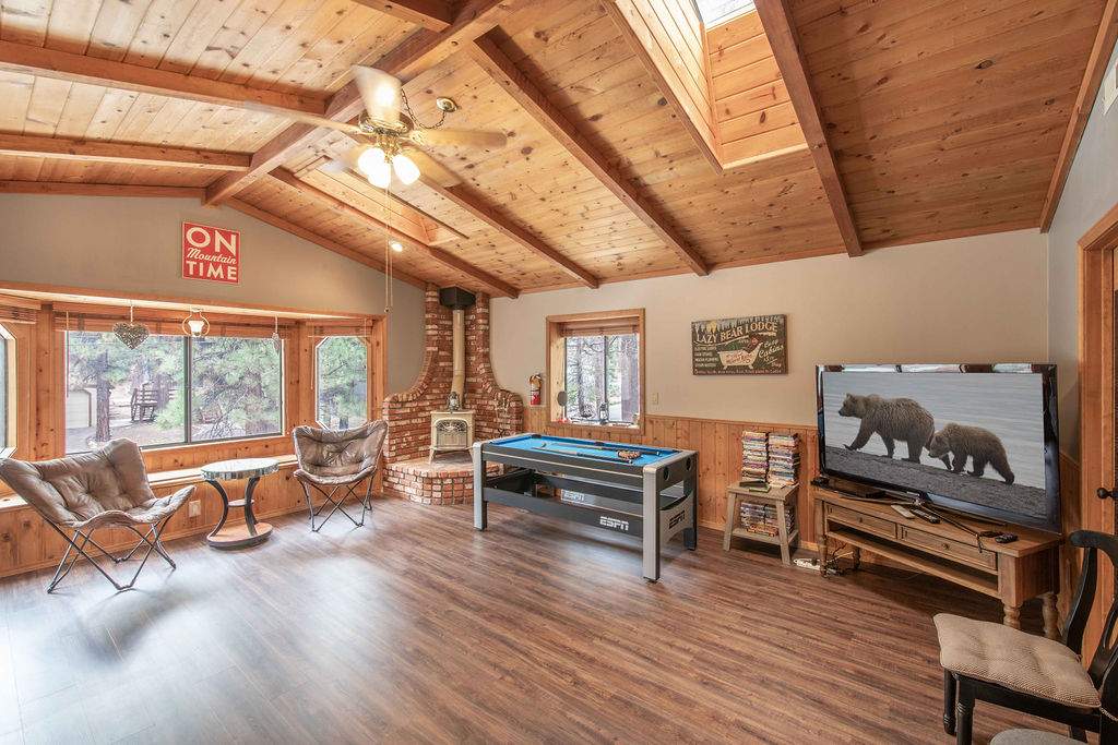 Fabulous Fox Farm location for this custom single-level home, just minutes to the ski slopes, lake, shopping and everything else Big Bear has to offer. Easy year-round access with attached 2-car garage and plenty of additional parking on the circular concrete driveway. Enjoy the fresh mountain air on the covered front porch & back deck; gaze at the stars while soaking in the spa. Great room boasts beamed T&G ceilings w/skylight, wainscoting, and an impressive brick fireplace with efficient wood stove. Remodeled kitchen has stainless appliances, recessed lighting and adjacent dining area. Other upgrades done in 2017 include all new flooring, new interior paint, and new vanities in the bathrooms. 3 bedrooms, one a pass-through to the third large bedroom, currently used as a game/family room + sleeping area, features beamed ceilings w/skylights and a Franklin stove. This home has all the makings of a fantastic weekend getaway, income-producing vacation rental, or full-time residence.