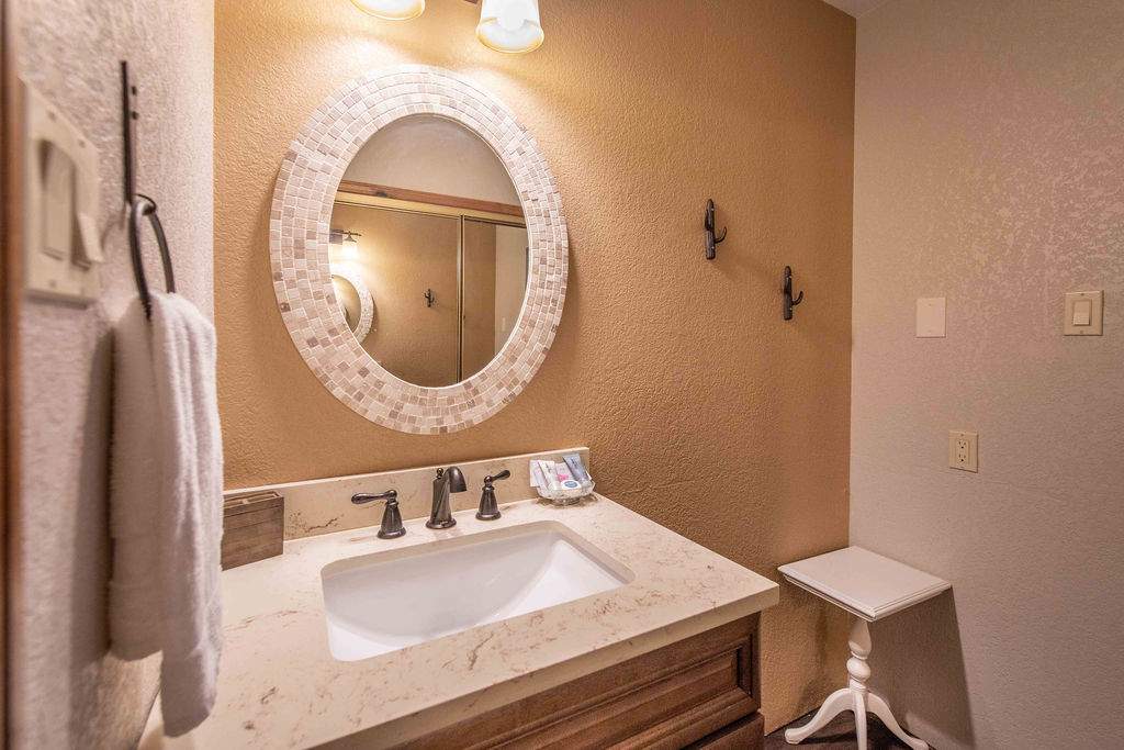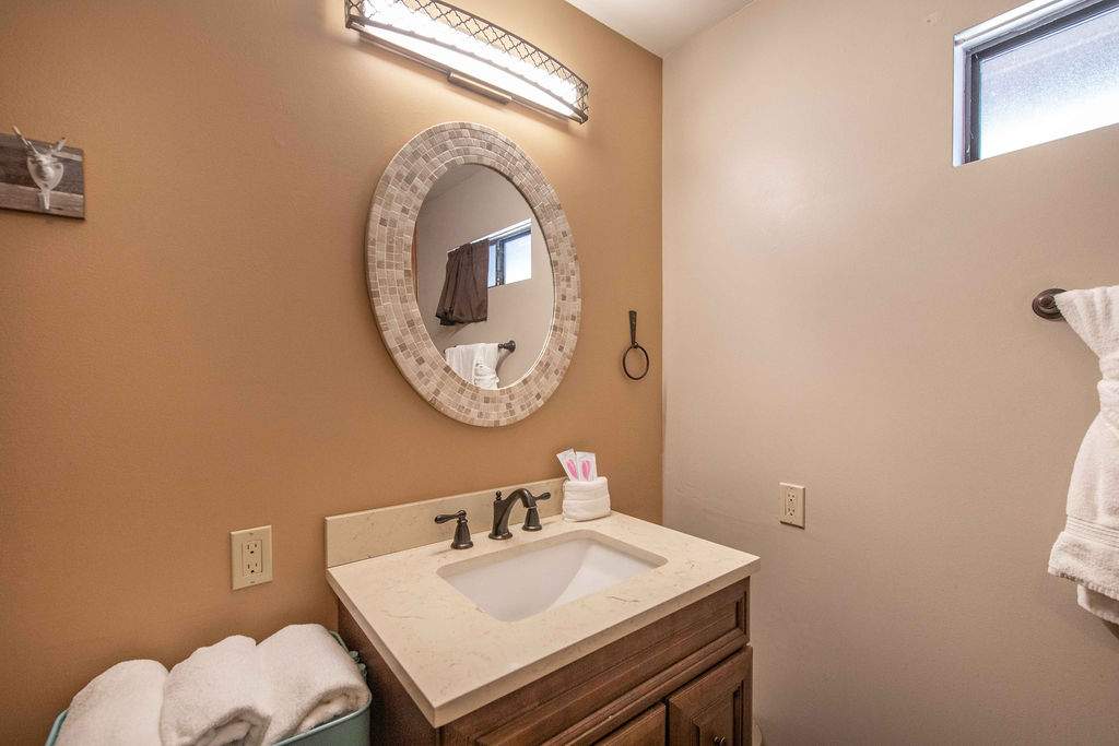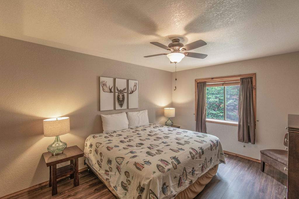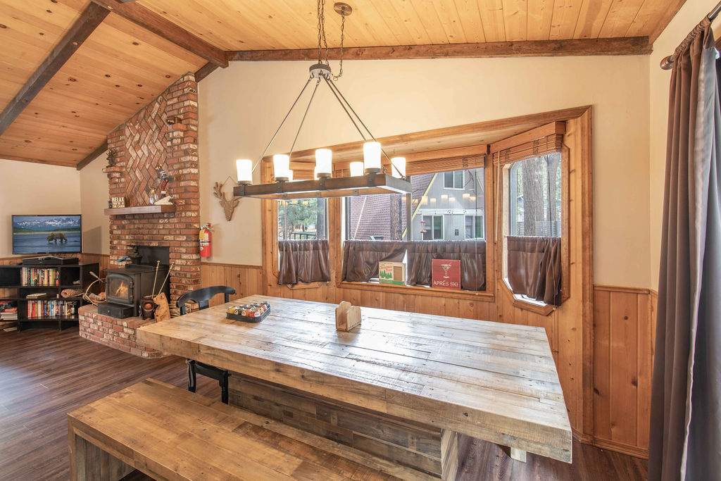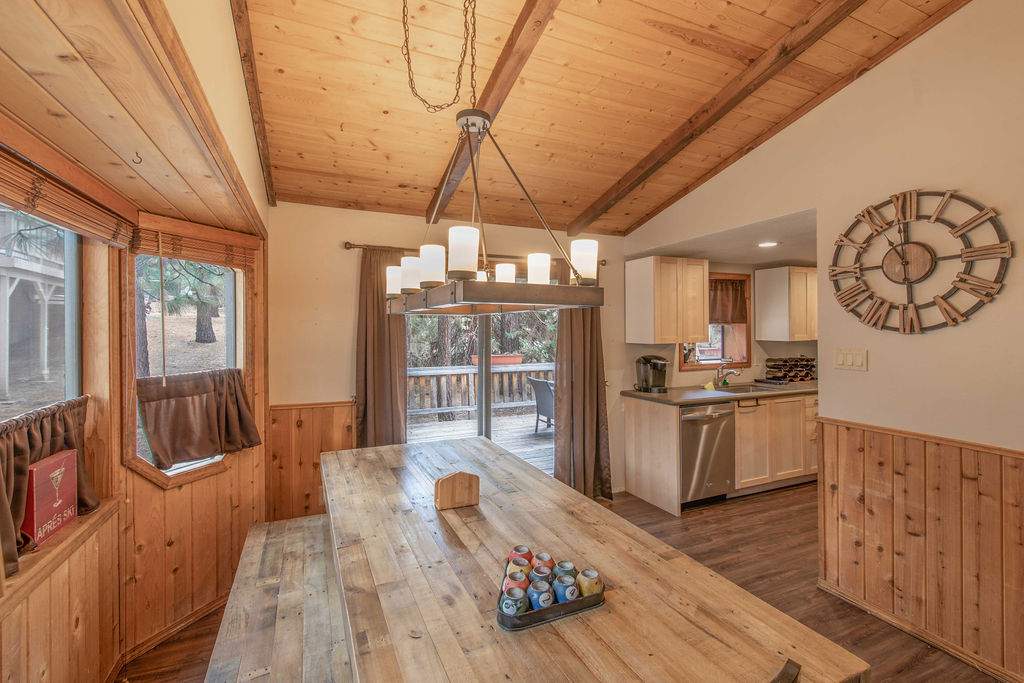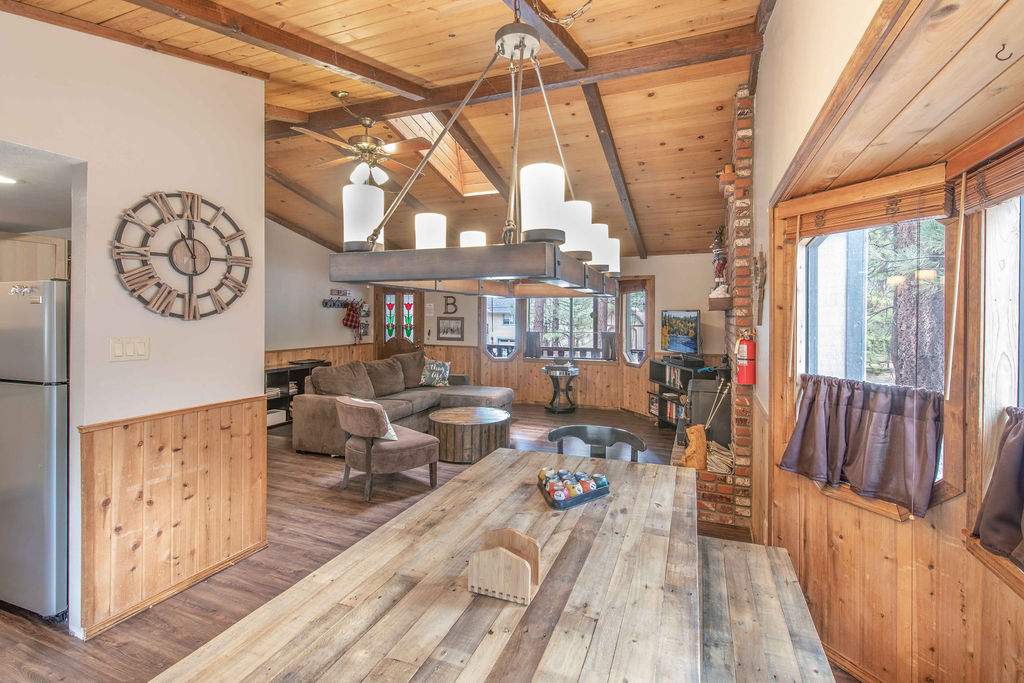 Fabulous Fox Farm location for this custom single-level home, just minutes to the ski slopes, lake, shopping and everything else Big Bear has to offer. Easy year-round access with attached 2-car garage and plenty of additional parking on the circular concrete driveway. Enjoy the fresh mountain air on the covered front porch & back deck; gaze at the stars while soaking in the spa. Great room boasts beamed T&G ceilings w/skylight, wainscoting, and an impressive brick fireplace with efficient wood stove. Remodeled kitchen has stainless appliances, recessed lighting and adjacent dining area. Other upgrades done in 2017 include all new flooring, new interior paint, and new vanities in the bathrooms. 3 bedrooms, one a pass-through to the third large bedroom, currently used as a game/family room + sleeping area, features beamed ceilings w/skylights and a Franklin stove. This home has all the makings of a fantastic weekend getaway, income-producing vacation rental, or full-time residence.