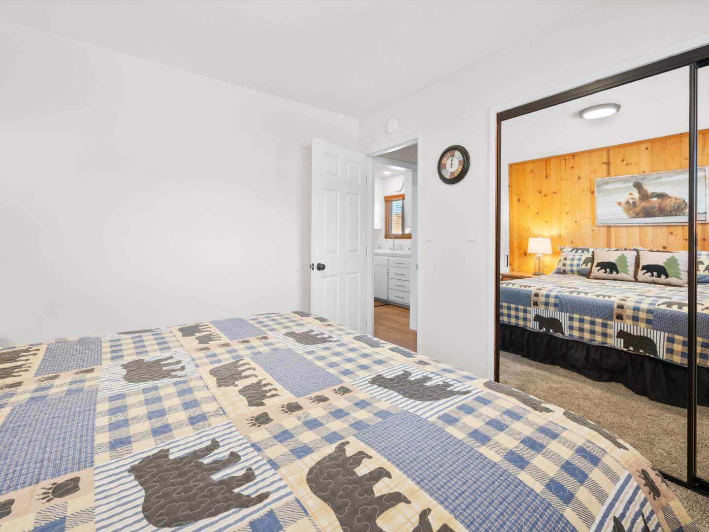 This lovely cottage is centrally located in Big Bear Lake, and is only one block to the lake! Just minutes from the Village, ski resorts, dining, and year-round recreation—yet tucked away enough to feel like your own private mountain retreat. Inside, the open floor plan with vaulted, T&G ceilings and the classic brick wood-burning fireplace, help create a cozy cabin atmosphere. Thoughtfully updated throughout, this home features new flooring (a mix of upgraded wood vinyl plank and plush carpet), a beautifully remodeled bathroom, newer appliances, fresh interior paint, and all new interior and exterior doors—with a stunning custom-carved wood front door that adds a touch of artistry and mountain flair. Comfort is enhanced with a new split A/C and heating system, ensuring year-round enjoyment. Step outside to the newly built deck, ideal for outdoor dining or soaking up the alpine sunshine. The freshly fenced yard adds privacy and convenience if you have pets, and the street-to-street lot with rear parking makes for easy access. Whether searching for a peaceful personal getaway or a popular “tiny cabin” style vacation rental with excellent income potential, this sweet retreat checks every box!