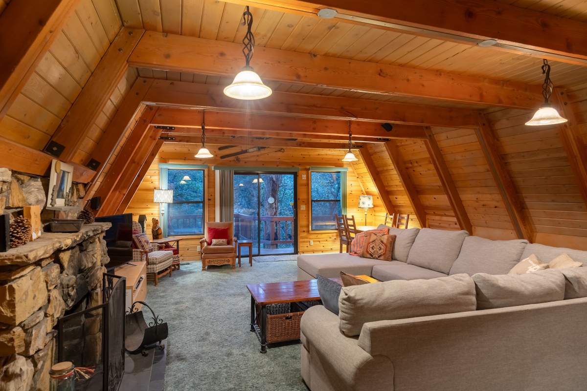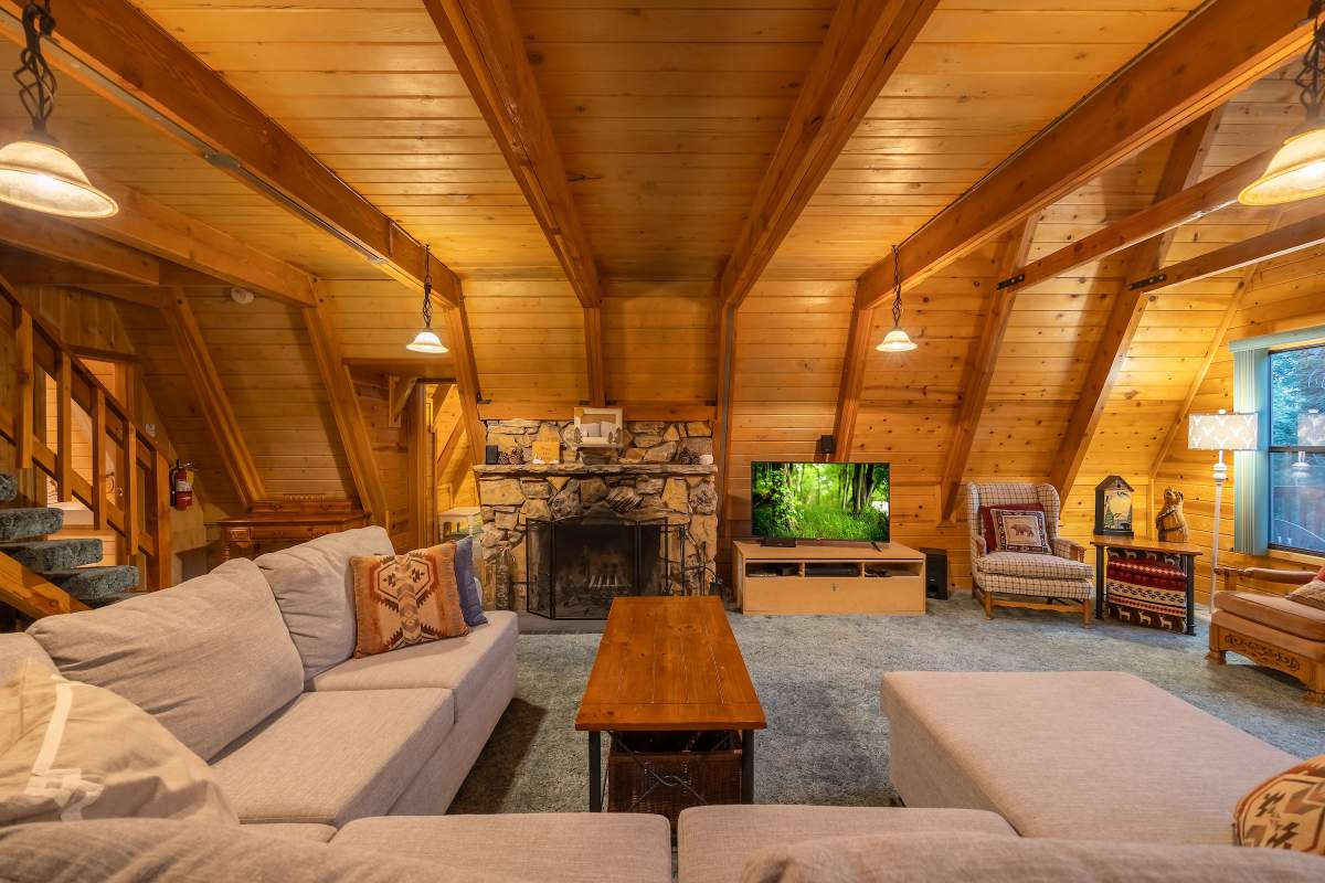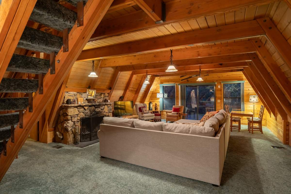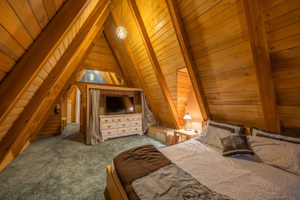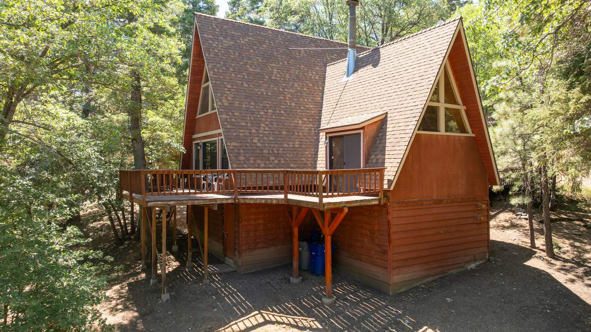 Sweet retreat. Ever popular A-frame style cabin situated in a serene treehouse setting in upper Moonridge. Enjoy open views and space from the neighbors out on the front and back decks. Warm woodsy interior, a wide open great room with beamed ceilings, rock fireplace, and abundant windows to bring the outside in. Main level master suite with impressive vaulted ceilings and a patio door accessing the back deck. Second bedroom upstairs plus a large loft with a closet that can be used as additional sleeping area. Secure storage space in the buildup area underneath the cabin. Sprawling 9000+ sq ft lot offers winter fun with your own sledding hill. Level parking at the street level – no steep driveways! So close to Bear Mountain resort and forest trails. Come discover your happy place in the mountains.
