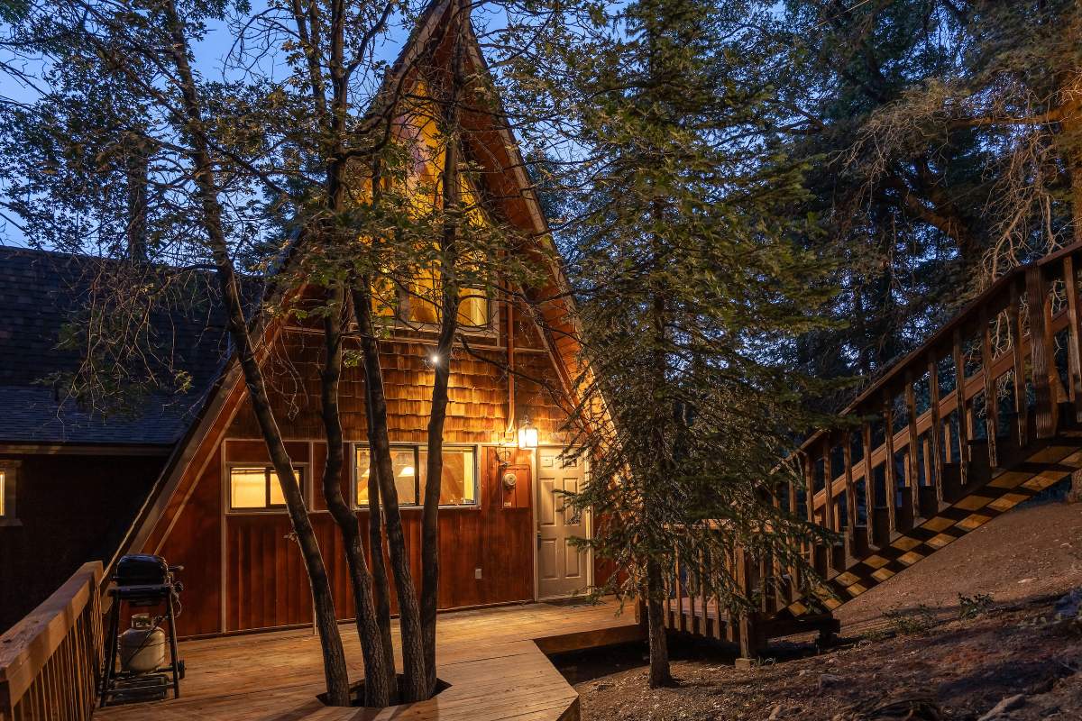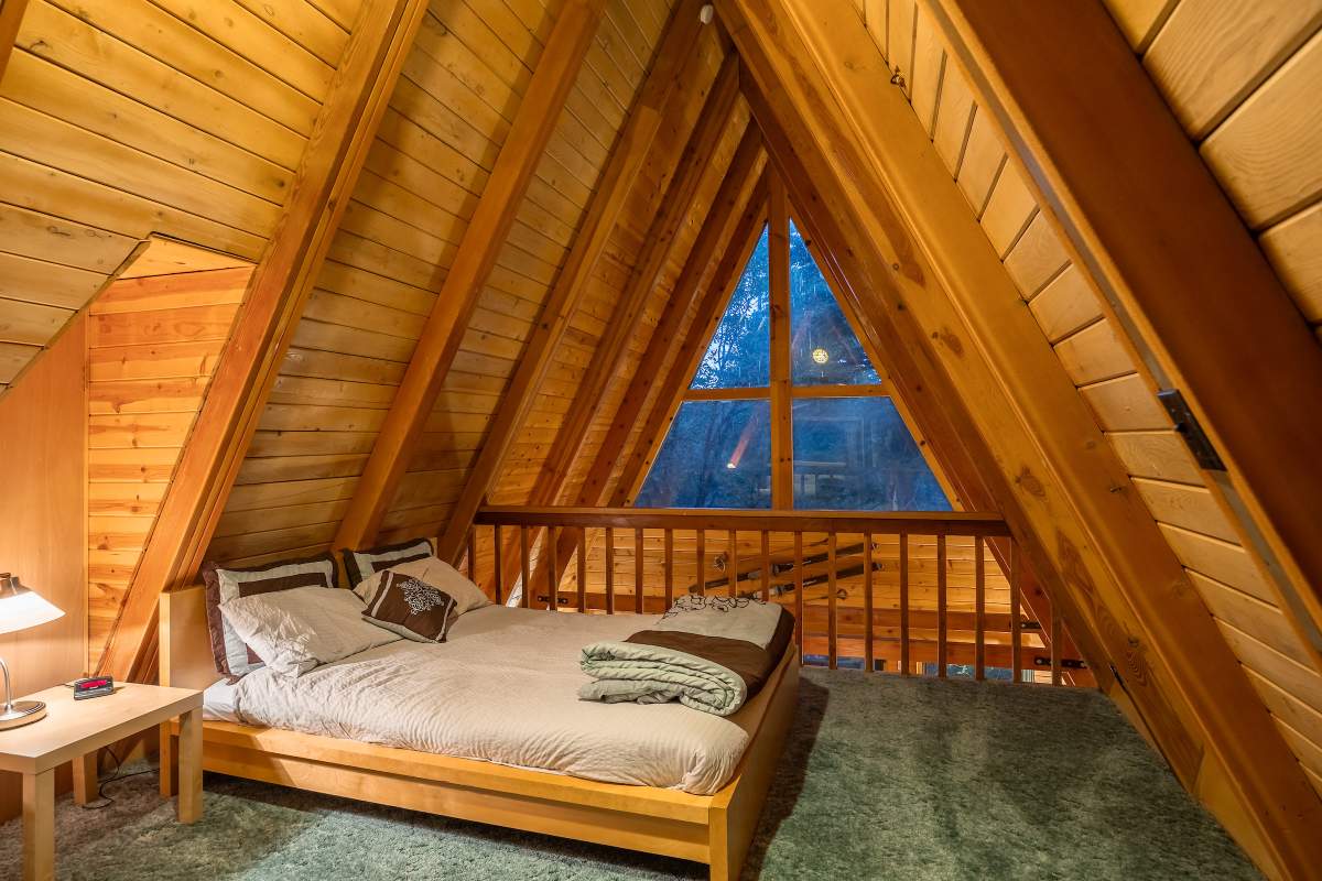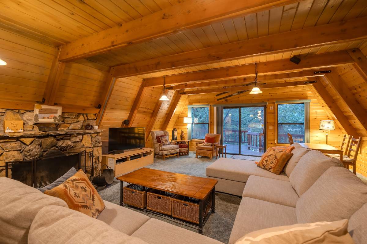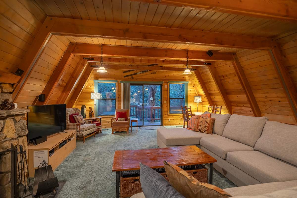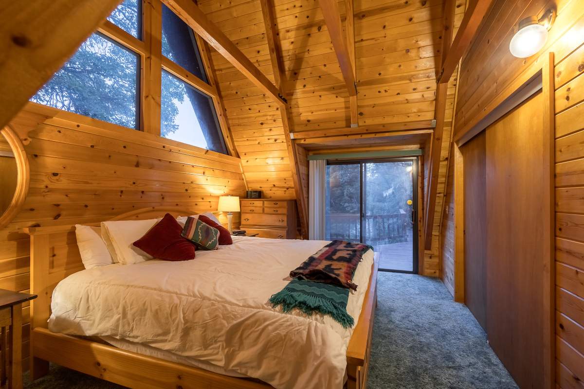 Sweet retreat. Ever popular A-frame style cabin situated in a serene treehouse setting in upper Moonridge. Enjoy open views and space from the neighbors out on the front and back decks. Warm woodsy interior, a wide open great room with beamed ceilings, rock fireplace, and abundant windows to bring the outside in. Main level master suite with impressive vaulted ceilings and a patio door accessing the back deck. Second bedroom upstairs plus a large loft with a closet that can be used as additional sleeping area. Secure storage space in the buildup area underneath the cabin. Sprawling 9000+ sq ft lot offers winter fun with your own sledding hill. Level parking at the street level – no steep driveways! So close to Bear Mountain resort and forest trails. Come discover your happy place in the mountains.