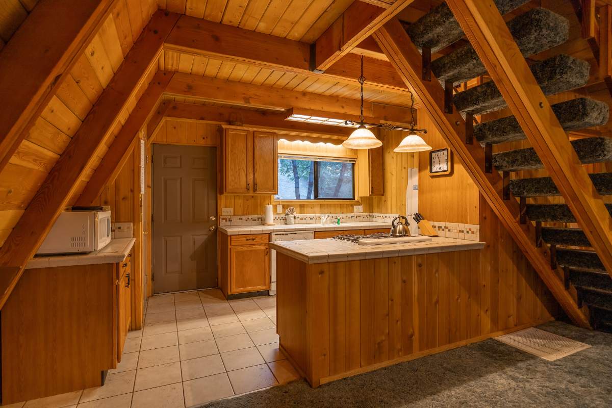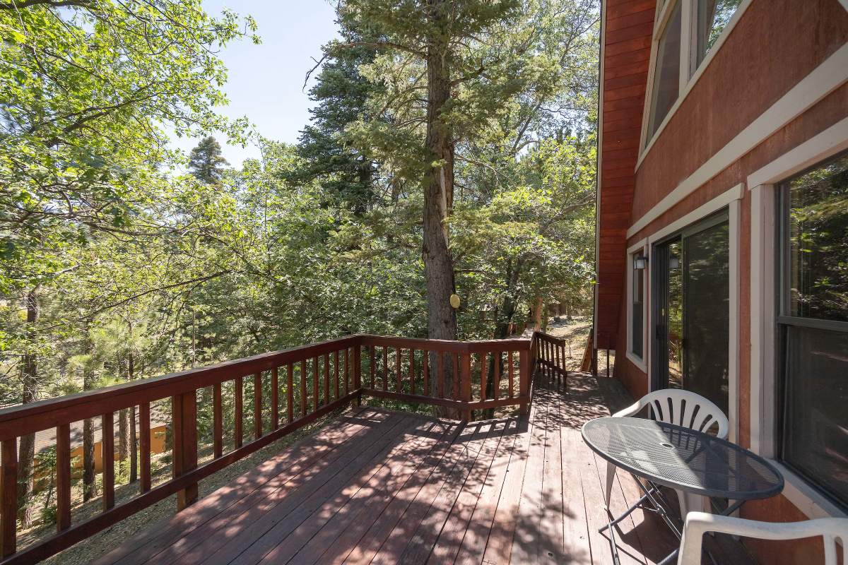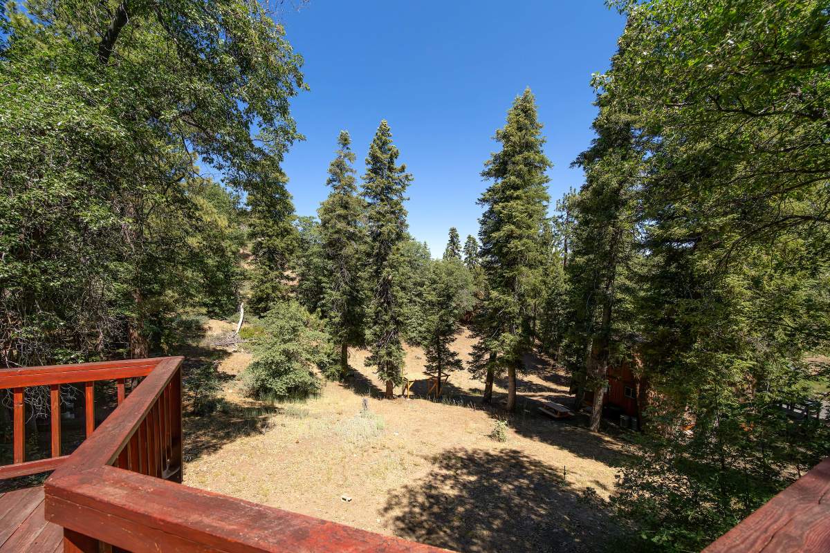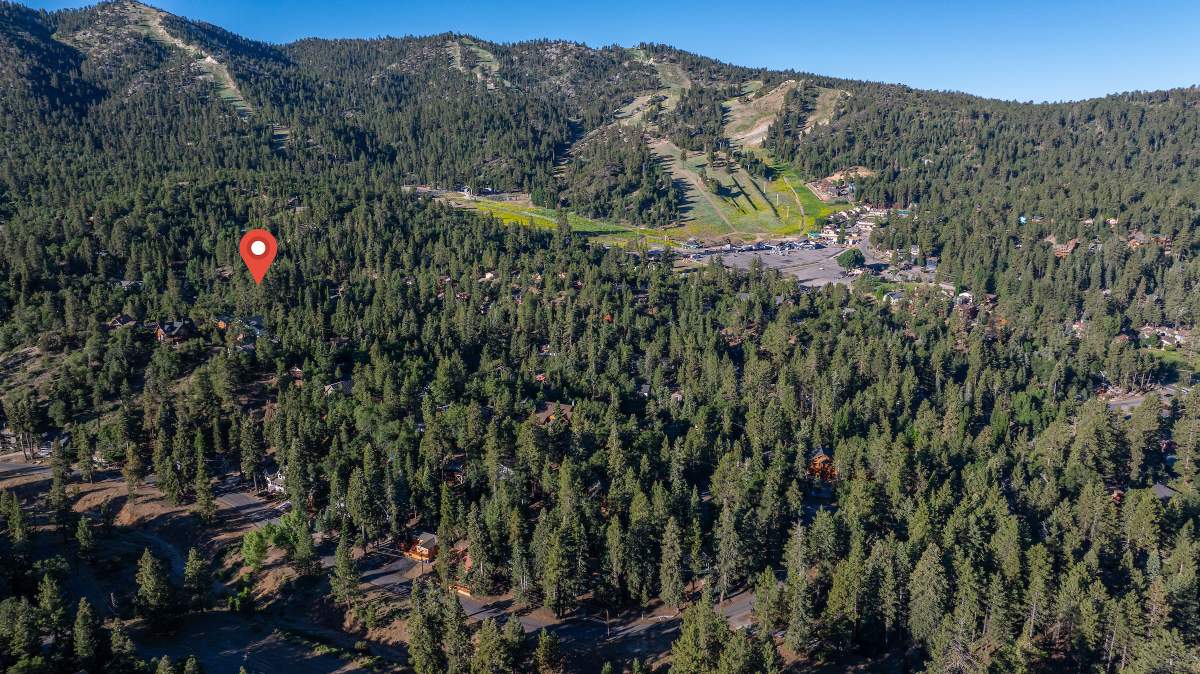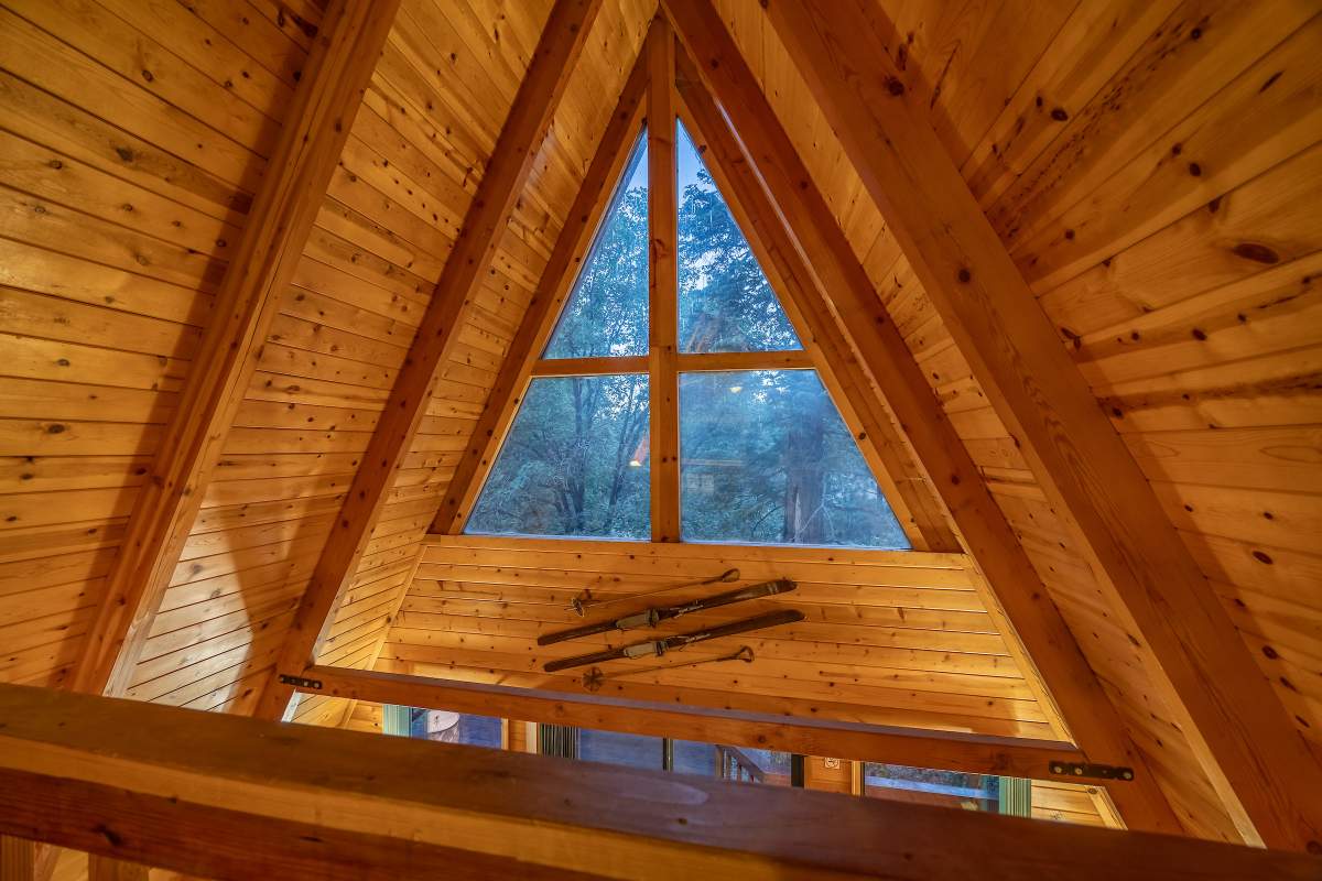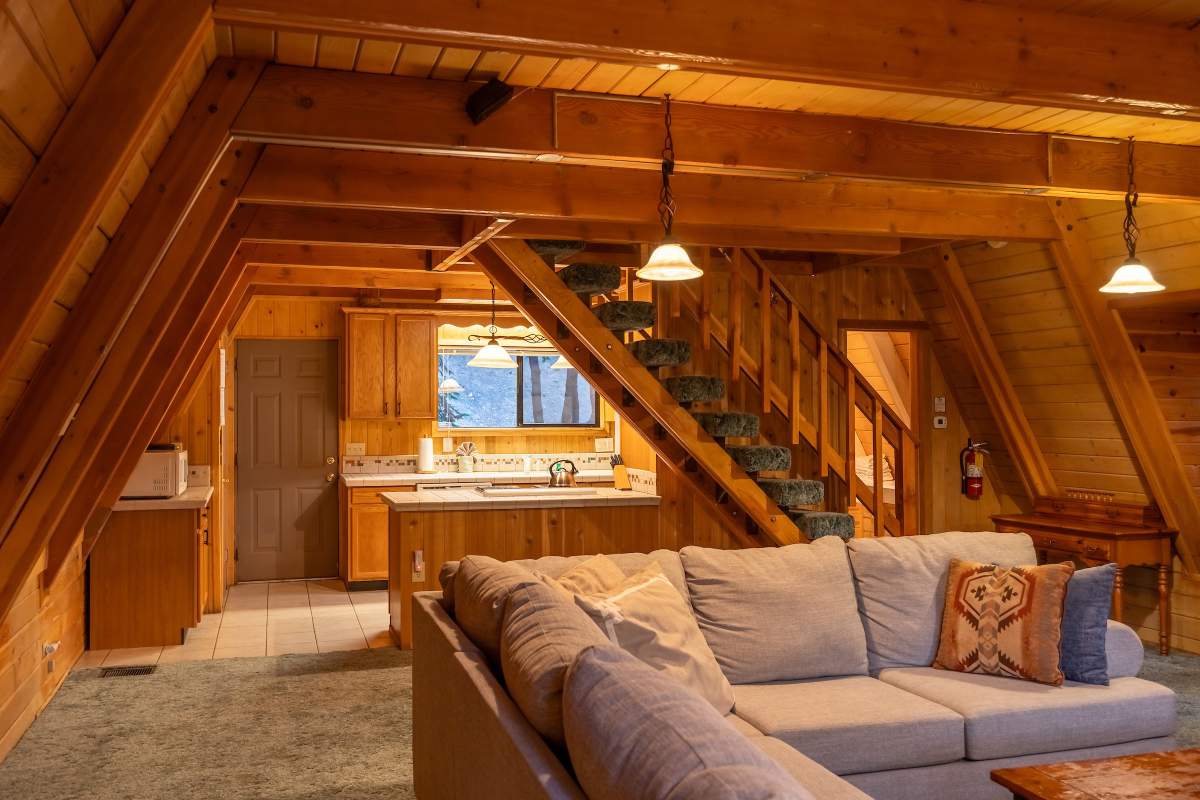Sweet retreat. Ever popular A-frame style cabin situated in a serene treehouse setting in upper Moonridge. Enjoy open views and space from the neighbors out on the front and back decks. Warm woodsy interior, a wide open great room with beamed ceilings, rock fireplace, and abundant windows to bring the outside in. Main level master suite with impressive vaulted ceilings and a patio door accessing the back deck. Second bedroom upstairs plus a large loft with a closet that can be used as additional sleeping area. Secure storage space in the buildup area underneath the cabin. Sprawling 9000+ sq ft lot offers winter fun with your own sledding hill. Level parking at the street level – no steep driveways! So close to Bear Mountain resort and forest trails. Come discover your happy place in the mountains.
