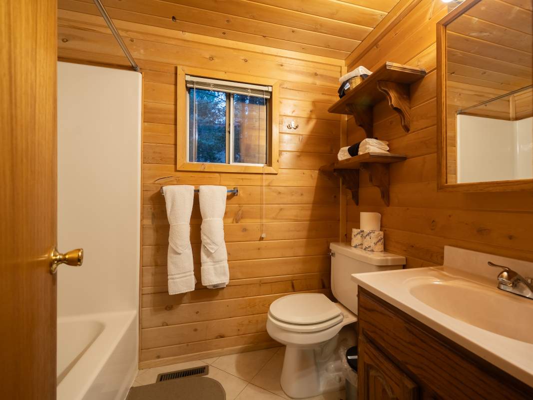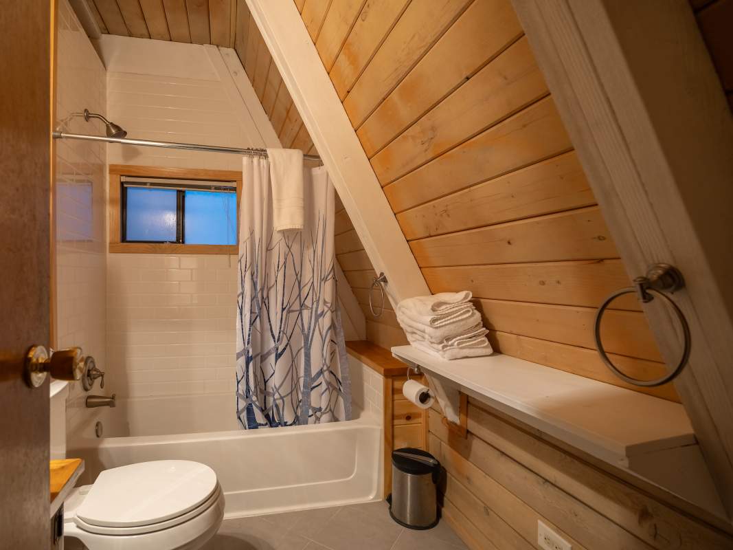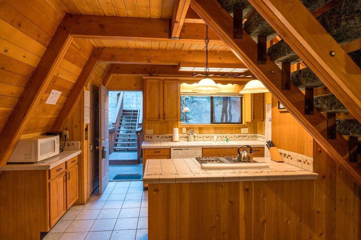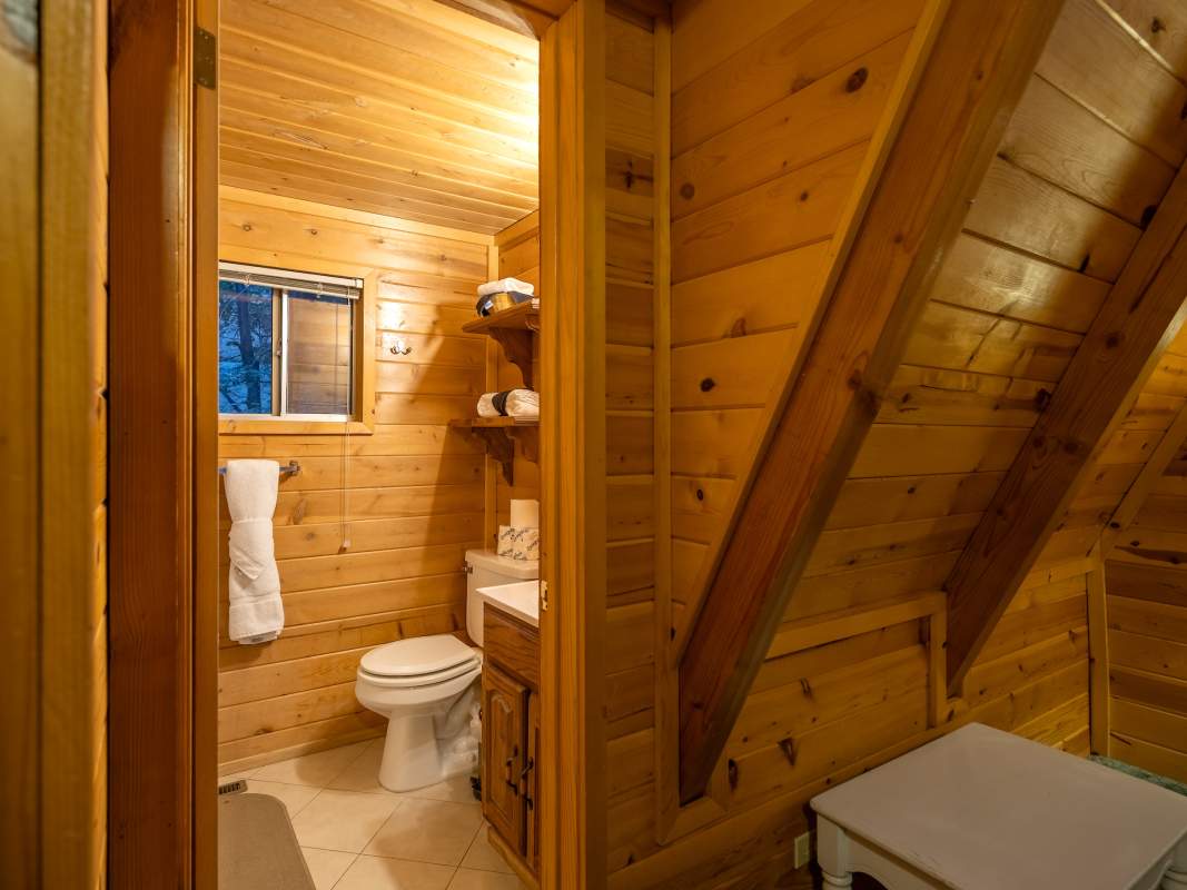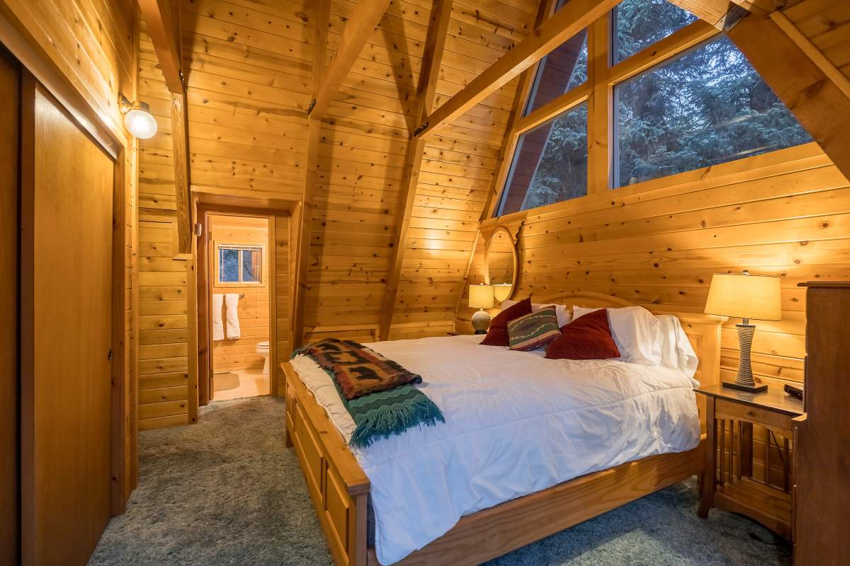 Sweet retreat. Ever popular A-frame style cabin situated in a serene treehouse setting in upper Moonridge. Enjoy open views and space from the neighbors out on the front and back decks. Warm woodsy interior, a wide open great room with beamed ceilings, rock fireplace, and abundant windows to bring the outside in. Main level master suite with impressive vaulted ceilings and a patio door accessing the back deck. Second bedroom upstairs plus a large loft with a closet that can be used as additional sleeping area. Secure storage space in the buildup area underneath the cabin. Sprawling 9000+ sq ft lot offers winter fun with your own sledding hill. Level parking at the street level – no steep driveways! So close to Bear Mountain resort and forest trails. Come discover your happy place in the mountains.