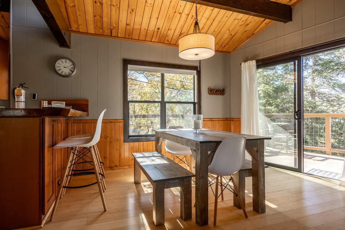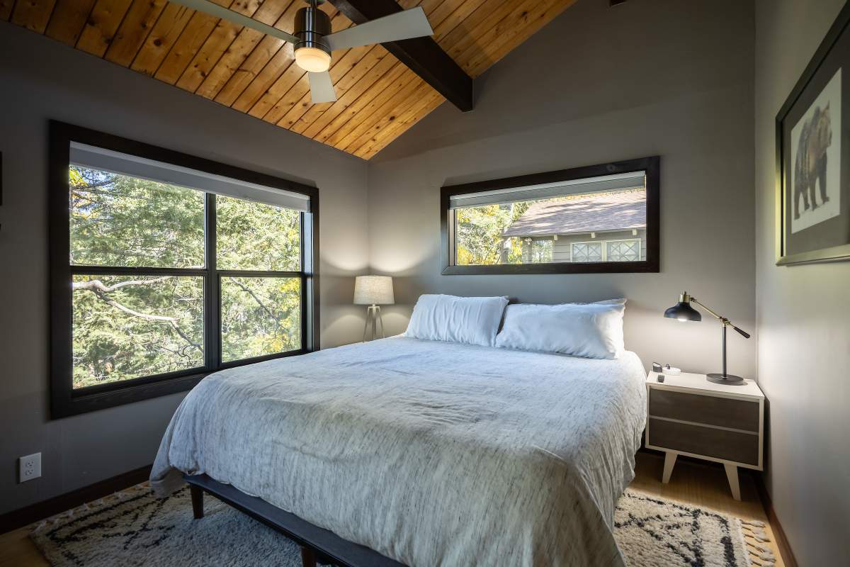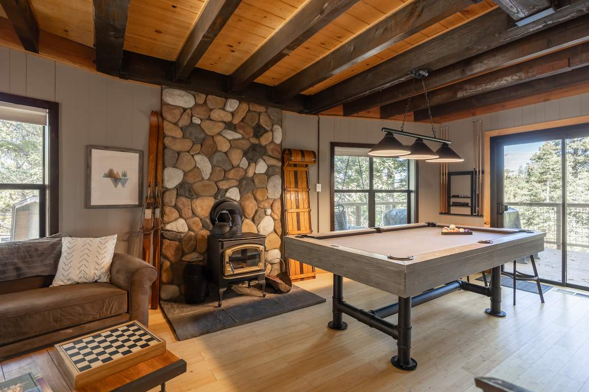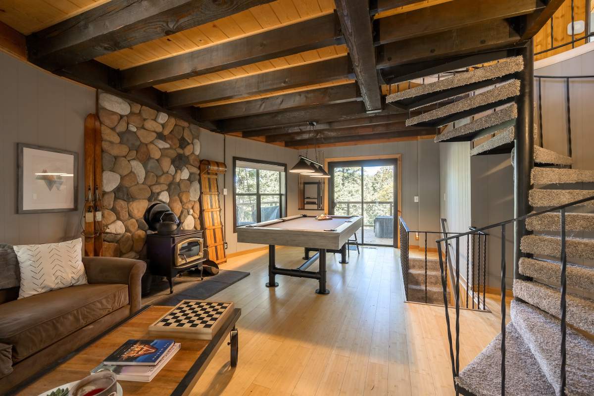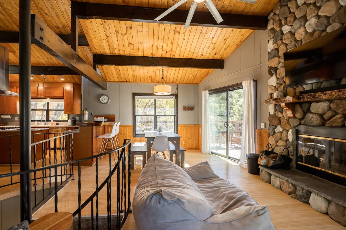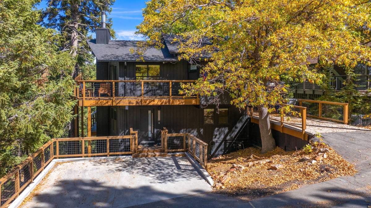 Perfectly positioned amongst the oaks and pines in upper Moonridge, this modern rustic tree house is truly something special. Intriguing architectural design and multi-level decking allow for intimate outdoor living, distant mountain views, and a feeling of serenity and seclusion. This cabin has been superbly remodeled with updates including a new roof, black aluminum Milgard windows and patio doors, siding, paint, completely rebuilt decking and entryways, and level concrete parking for 3-4 vehicles. All new furnishings and window coverings including an Aurhus sofa and Sleep Number bed, new A/C unit, and water heater. Main level living area features beamed ceilings, river rock fireplace, wainscoting, ceiling fan, a small loft, and deck access. The gorgeous kitchen offers abundant custom cabinetry, granite, high-end stainless appliances, an island with gas range and vented hood, new gas stove, wine fridge, a breakfast bar, and adjacent dining area. Middle level has second living area/family/game room with efficient wood stove, second bedroom, and bath, and access to deck and spa. Lower level offers a spacious third bedroom with custom tile flooring, sitting area, and access to the backyard. The sprawling 1/4 acre lot is awesome for winter snow play; would make a fantastic vacation rental. Enjoy the tree-lined street with the joy of the changing seasons on display, and views of the ski slopes revealed when the leaves fall away. Go experience this enchanting property today.