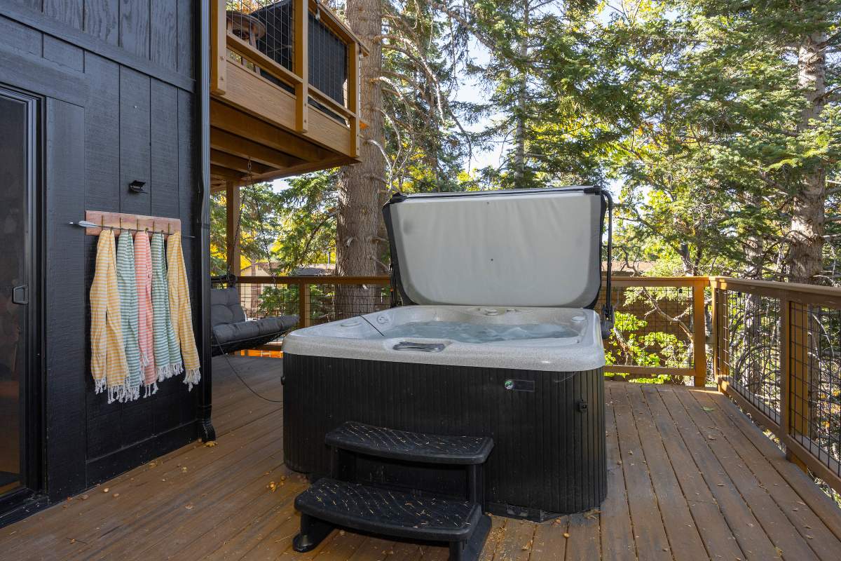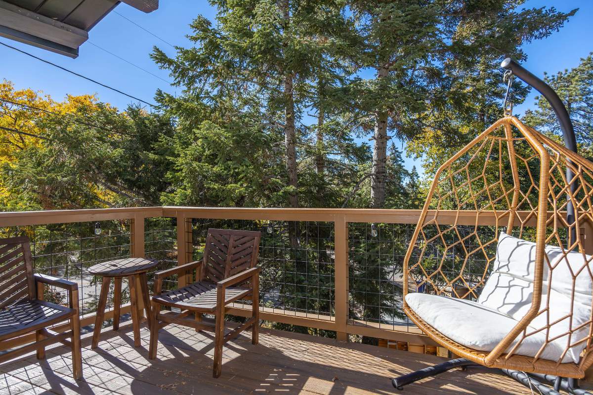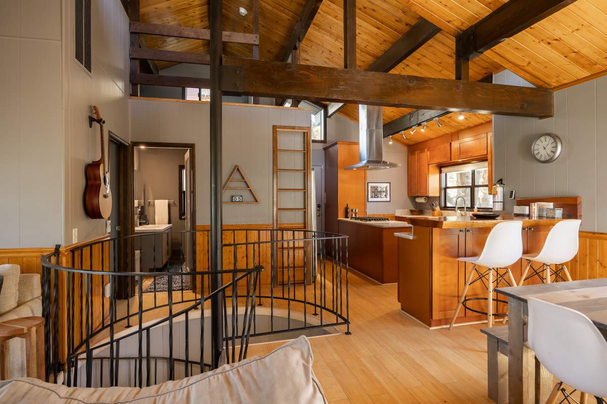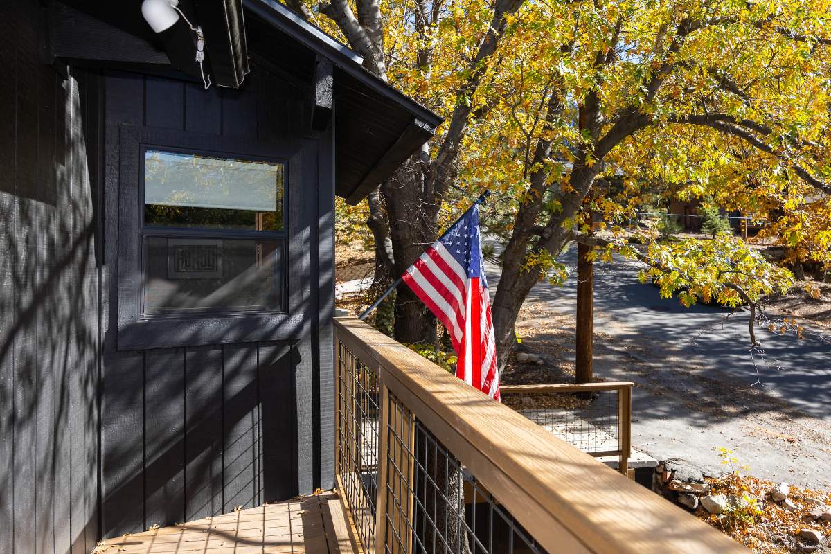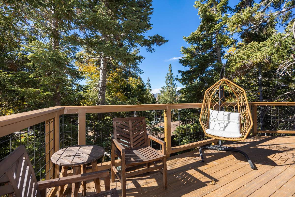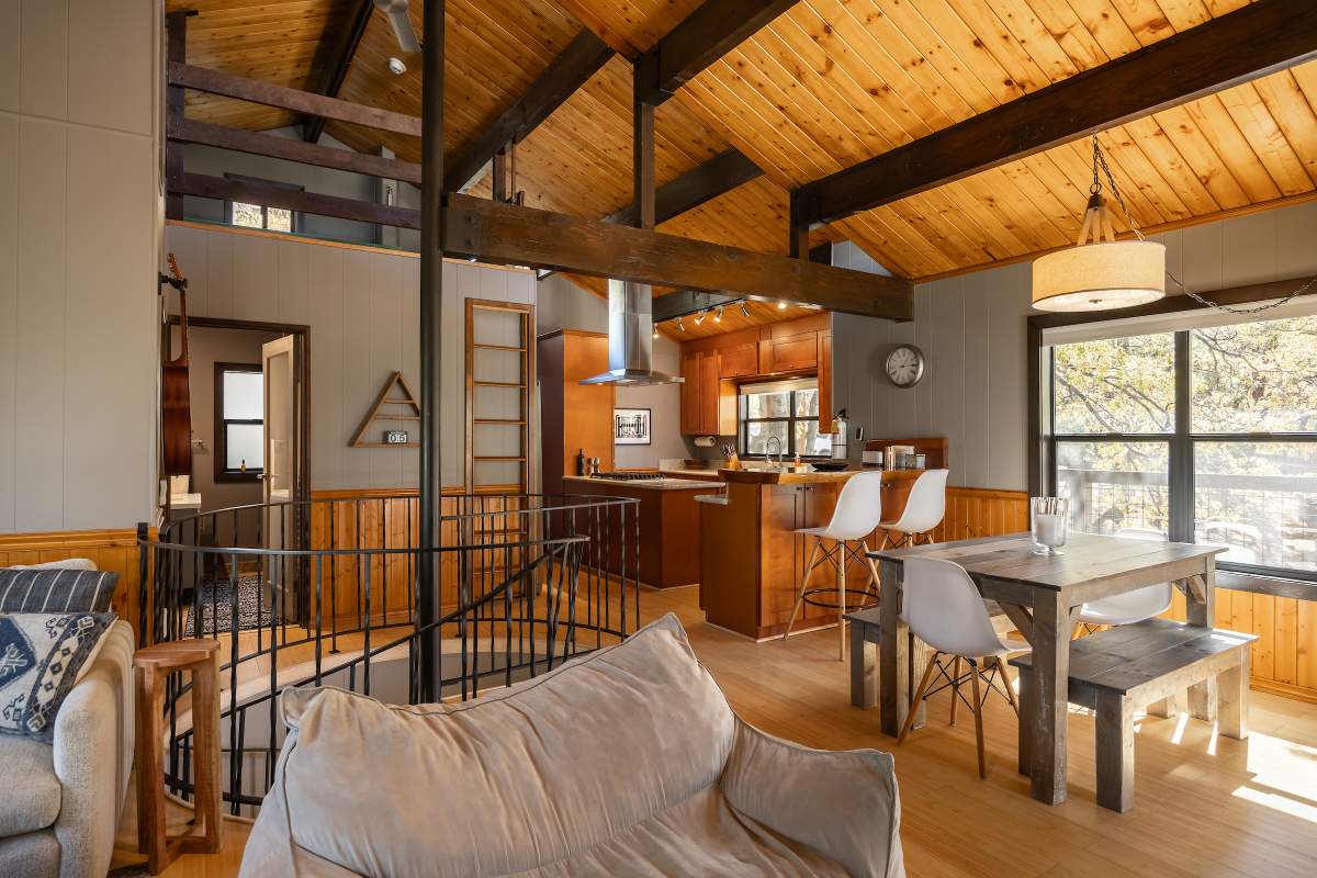 Perfectly positioned amongst the oaks and pines in upper Moonridge, this modern rustic tree house is truly something special. Intriguing architectural design and multi-level decking allow for intimate outdoor living, distant mountain views, and a feeling of serenity and seclusion. This cabin has been superbly remodeled with updates including a new roof, black aluminum Milgard windows and patio doors, siding, paint, completely rebuilt decking and entryways, and level concrete parking for 3-4 vehicles. All new furnishings and window coverings including an Aurhus sofa and Sleep Number bed, new A/C unit, and water heater. Main level living area features beamed ceilings, river rock fireplace, wainscoting, ceiling fan, a small loft, and deck access. The gorgeous kitchen offers abundant custom cabinetry, granite, high-end stainless appliances, an island with gas range and vented hood, new gas stove, wine fridge, a breakfast bar, and adjacent dining area. Middle level has second living area/family/game room with efficient wood stove, second bedroom, and bath, and access to deck and spa. Lower level offers a spacious third bedroom with custom tile flooring, sitting area, and access to the backyard. The sprawling 1/4 acre lot is awesome for winter snow play; would make a fantastic vacation rental. Enjoy the tree-lined street with the joy of the changing seasons on display, and views of the ski slopes revealed when the leaves fall away. Go experience this enchanting property today.