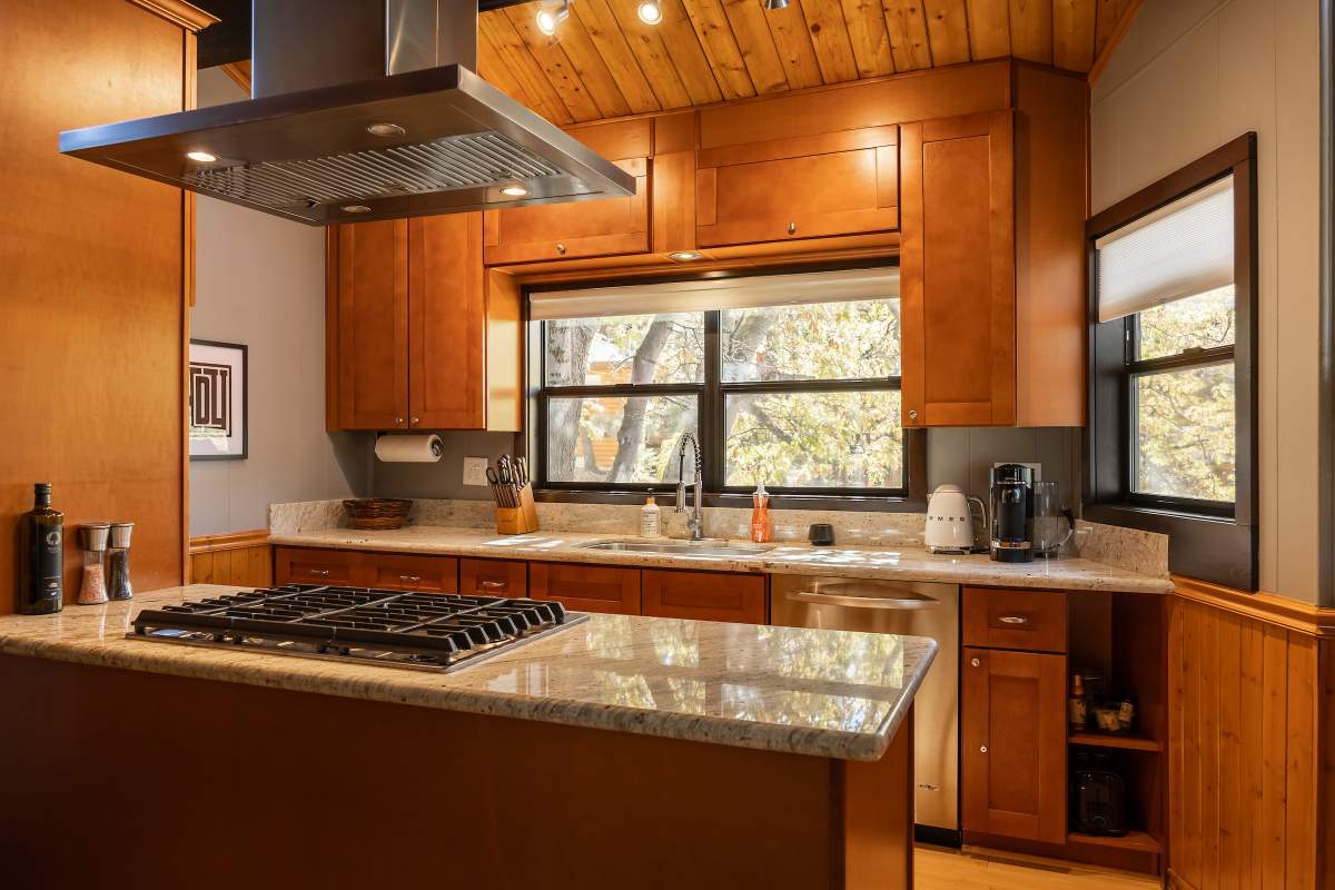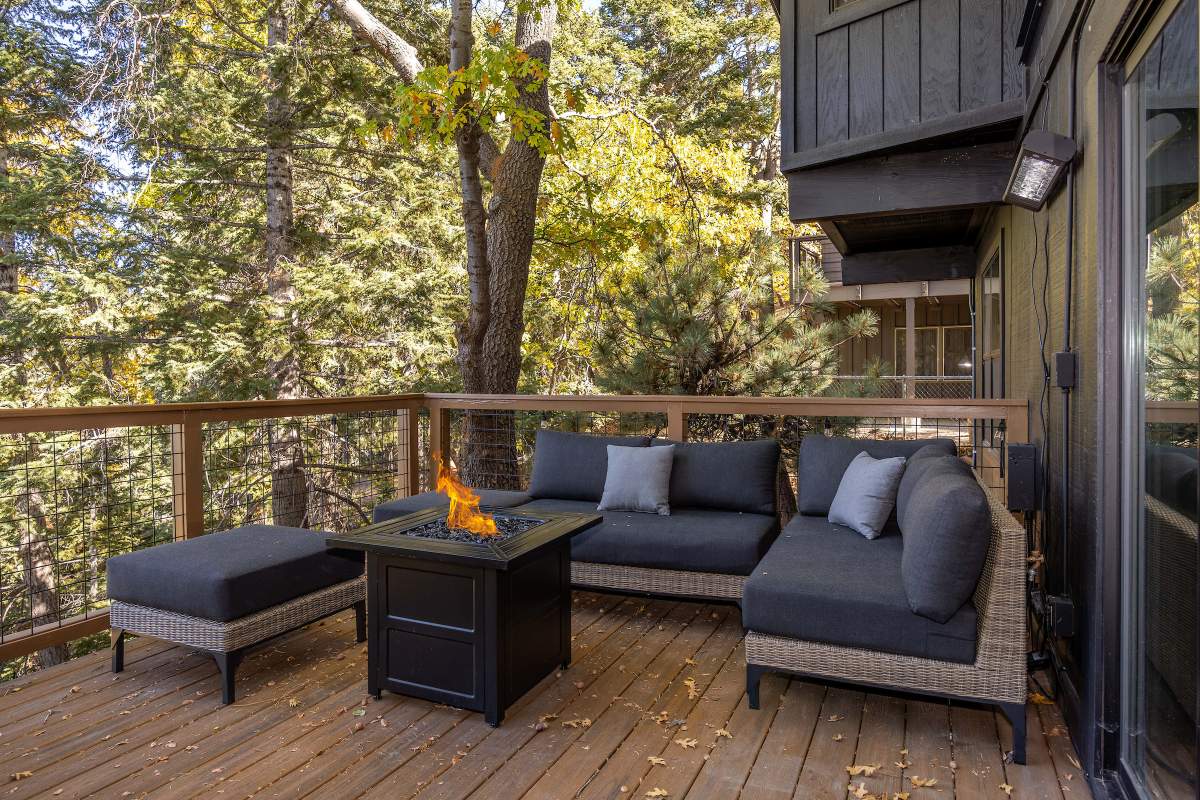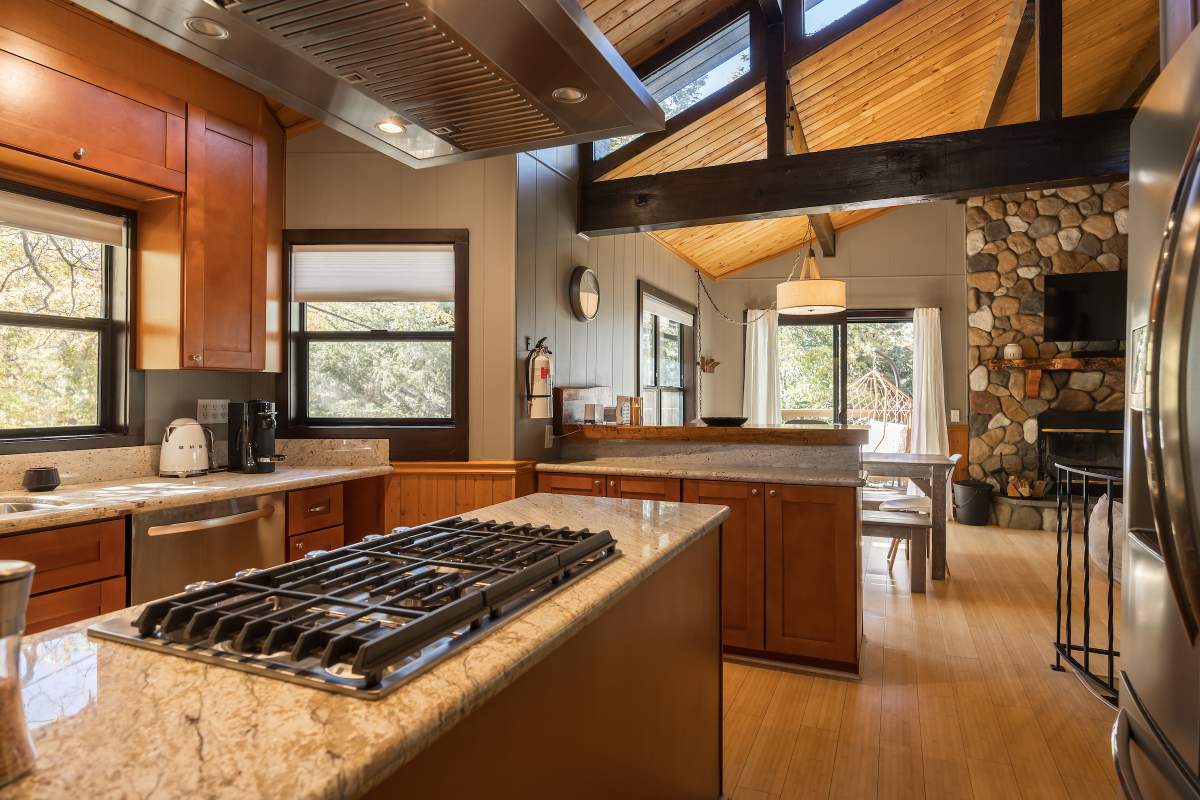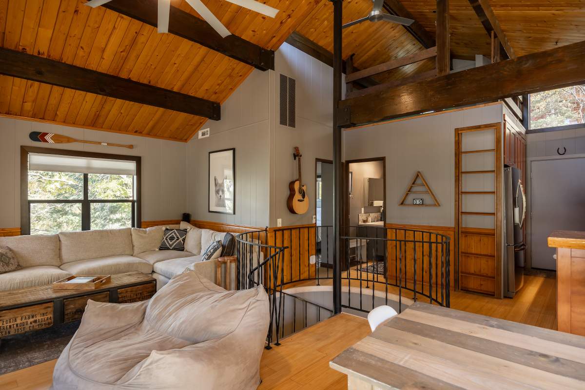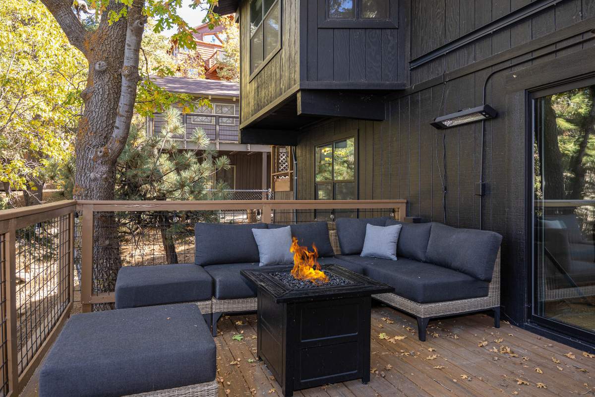 Perfectly positioned amongst the oaks and pines in upper Moonridge, this modern rustic tree house is truly something special. Intriguing architectural design and multi-level decking allow for intimate outdoor living, distant mountain views, and a feeling of serenity and seclusion. This cabin has been superbly remodeled with updates including a new roof, black aluminum Milgard windows and patio doors, siding, paint, completely rebuilt decking and entryways, and level concrete parking for 3-4 vehicles. All new furnishings and window coverings including an Aurhus sofa and Sleep Number bed, new A/C unit, and water heater. Main level living area features beamed ceilings, river rock fireplace, wainscoting, ceiling fan, a small loft, and deck access. The gorgeous kitchen offers abundant custom cabinetry, granite, high-end stainless appliances, an island with gas range and vented hood, new gas stove, wine fridge, a breakfast bar, and adjacent dining area. Middle level has second living area/family/game room with efficient wood stove, second bedroom, and bath, and access to deck and spa. Lower level offers a spacious third bedroom with custom tile flooring, sitting area, and access to the backyard. The sprawling 1/4 acre lot is awesome for winter snow play; would make a fantastic vacation rental. Enjoy the tree-lined street with the joy of the changing seasons on display, and views of the ski slopes revealed when the leaves fall away. Go experience this enchanting property today.