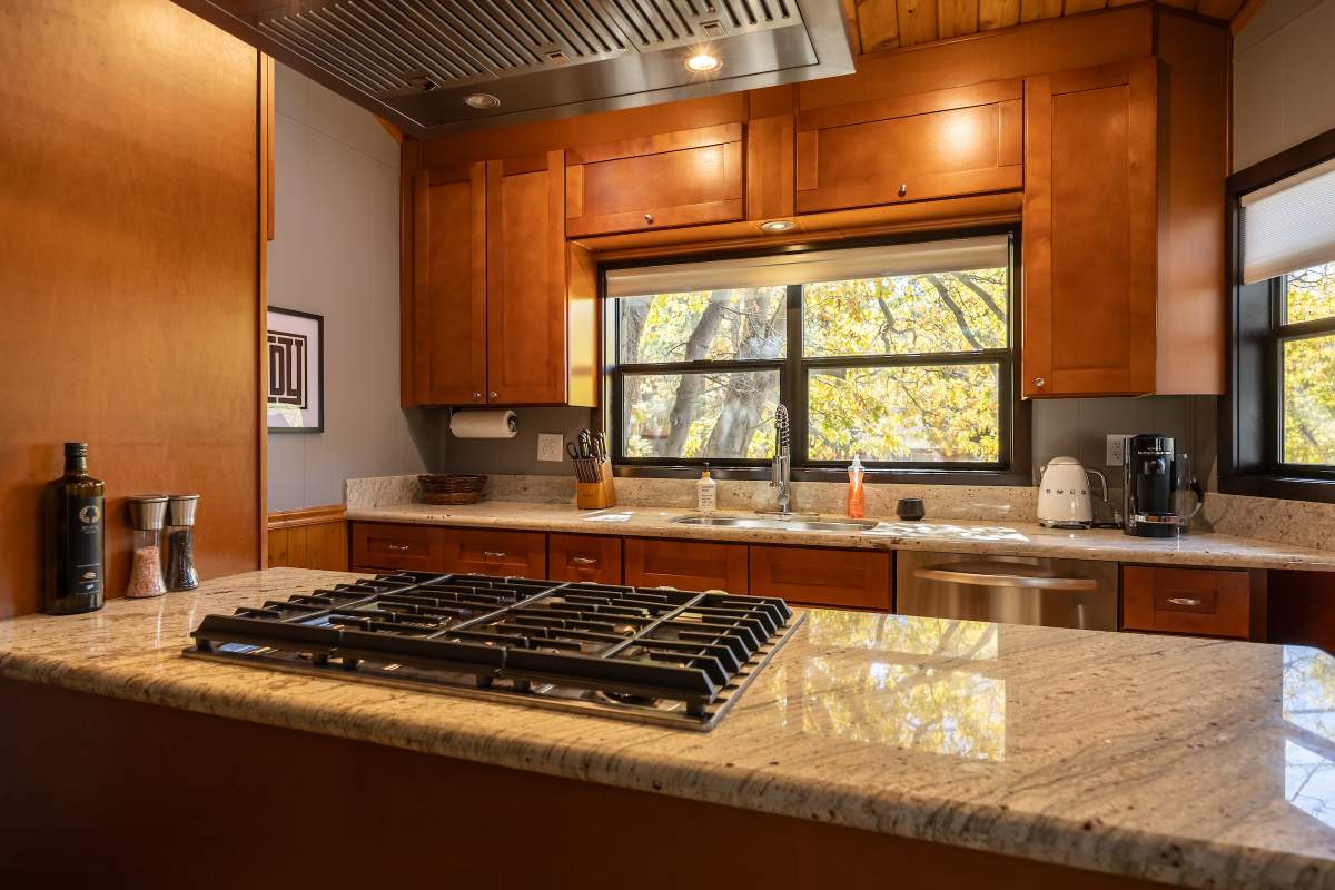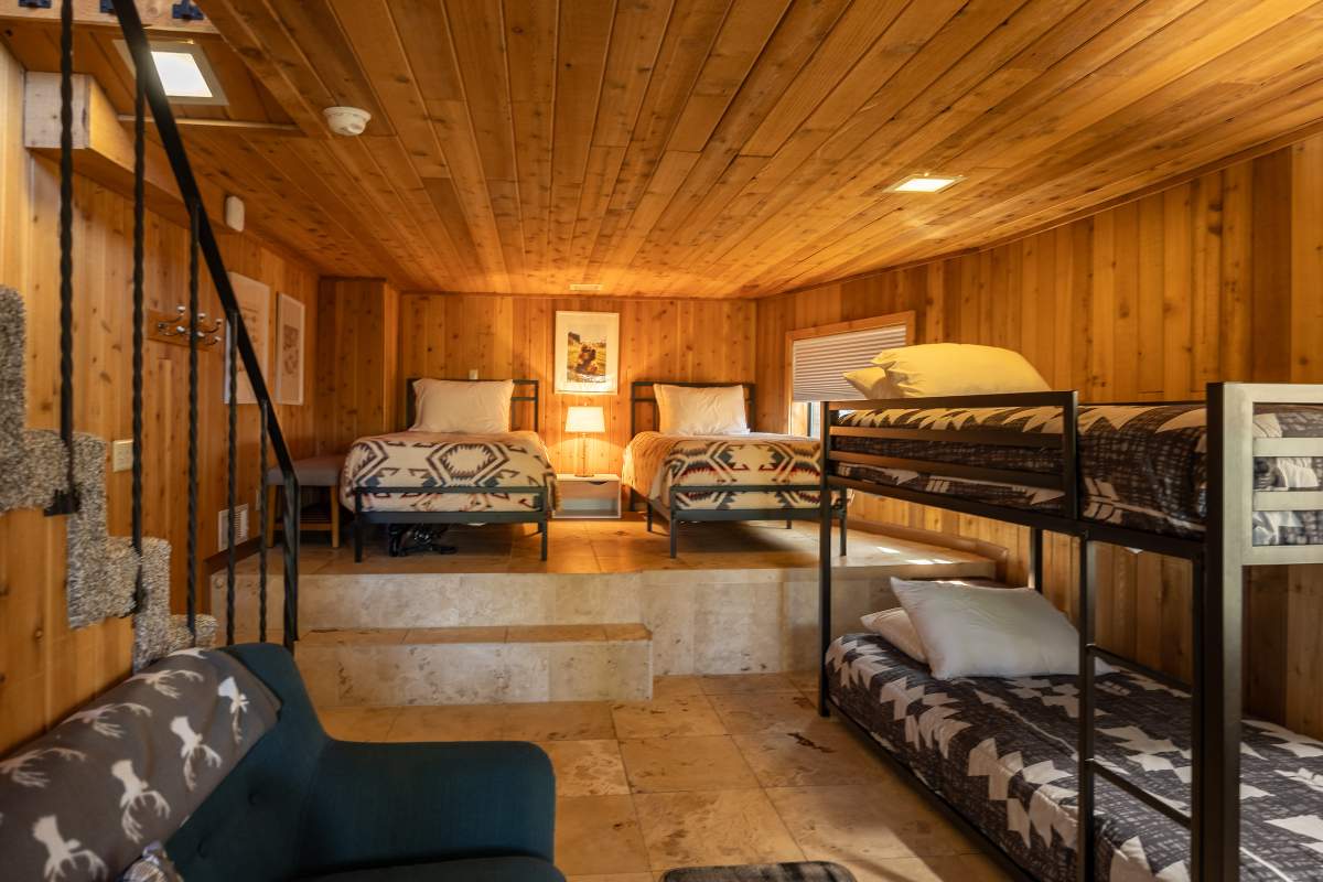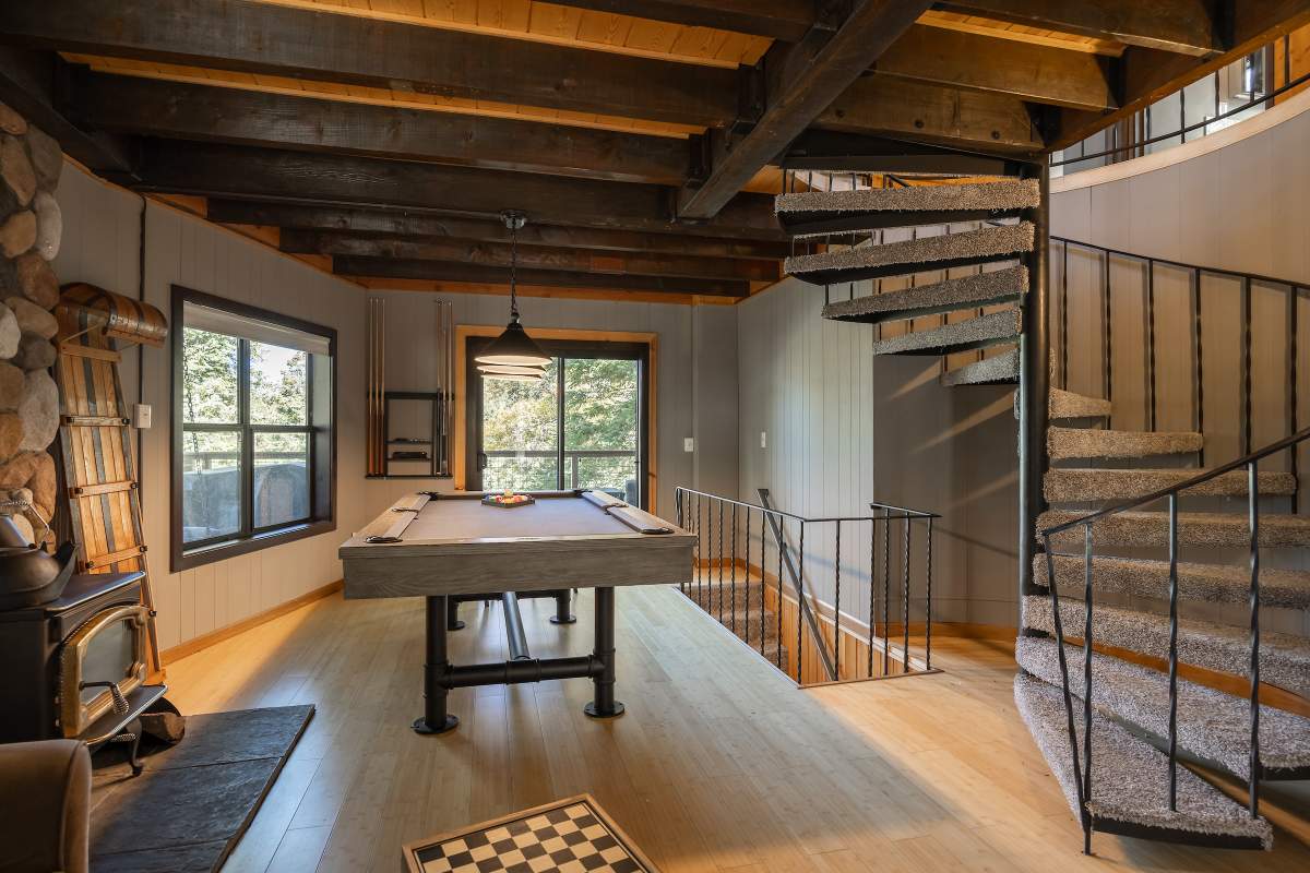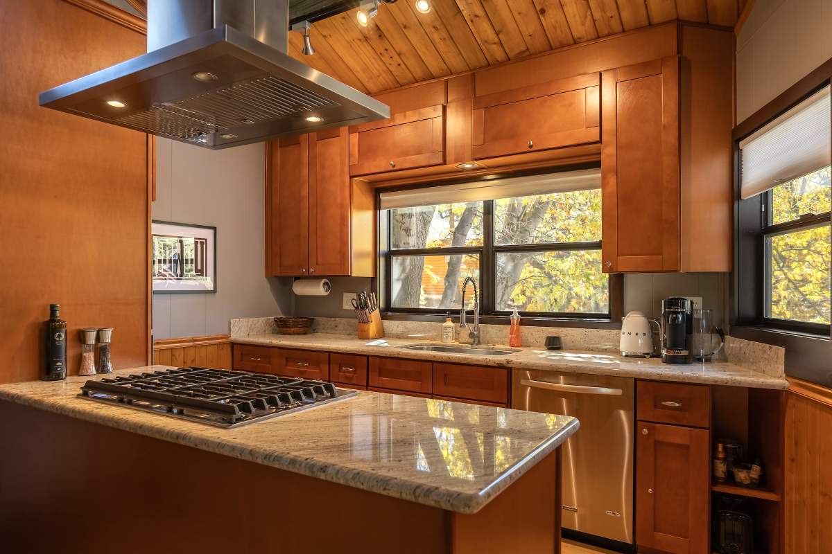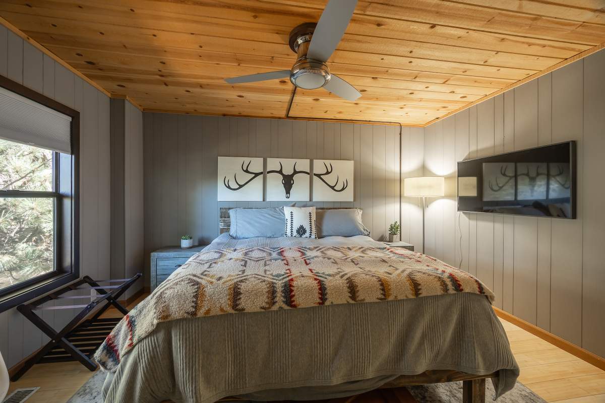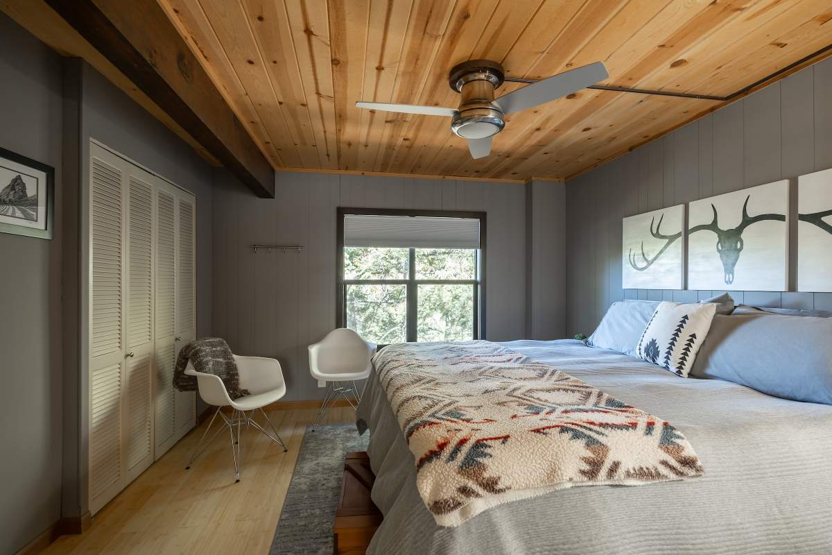 Perfectly positioned amongst the oaks and pines in upper Moonridge, this modern rustic tree house is truly something special. Intriguing architectural design and multi-level decking allow for intimate outdoor living, distant mountain views, and a feeling of serenity and seclusion. This cabin has been superbly remodeled with updates including a new roof, black aluminum Milgard windows and patio doors, siding, paint, completely rebuilt decking and entryways, and level concrete parking for 3-4 vehicles. All new furnishings and window coverings including an Aurhus sofa and Sleep Number bed, new A/C unit, and water heater. Main level living area features beamed ceilings, river rock fireplace, wainscoting, ceiling fan, a small loft, and deck access. The gorgeous kitchen offers abundant custom cabinetry, granite, high-end stainless appliances, an island with gas range and vented hood, new gas stove, wine fridge, a breakfast bar, and adjacent dining area. Middle level has second living area/family/game room with efficient wood stove, second bedroom, and bath, and access to deck and spa. Lower level offers a spacious third bedroom with custom tile flooring, sitting area, and access to the backyard. The sprawling 1/4 acre lot is awesome for winter snow play; would make a fantastic vacation rental. Enjoy the tree-lined street with the joy of the changing seasons on display, and views of the ski slopes revealed when the leaves fall away. Go experience this enchanting property today.