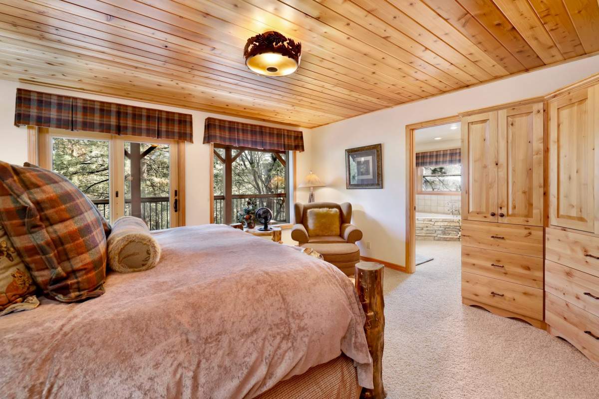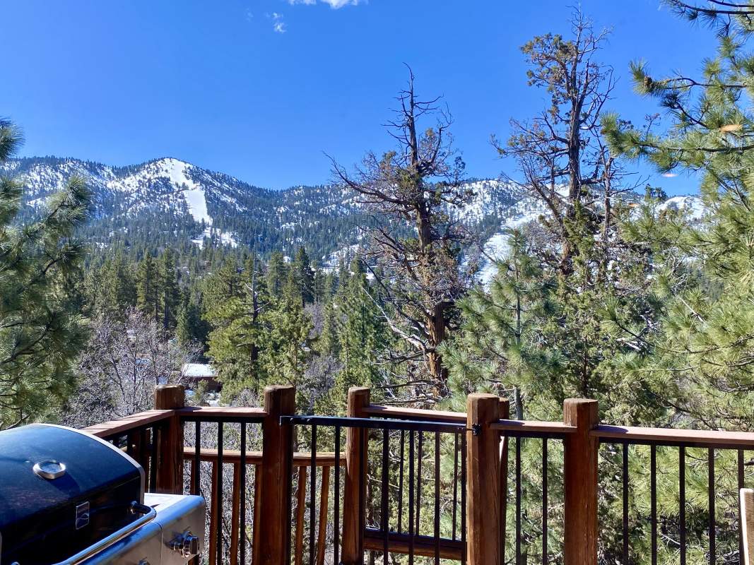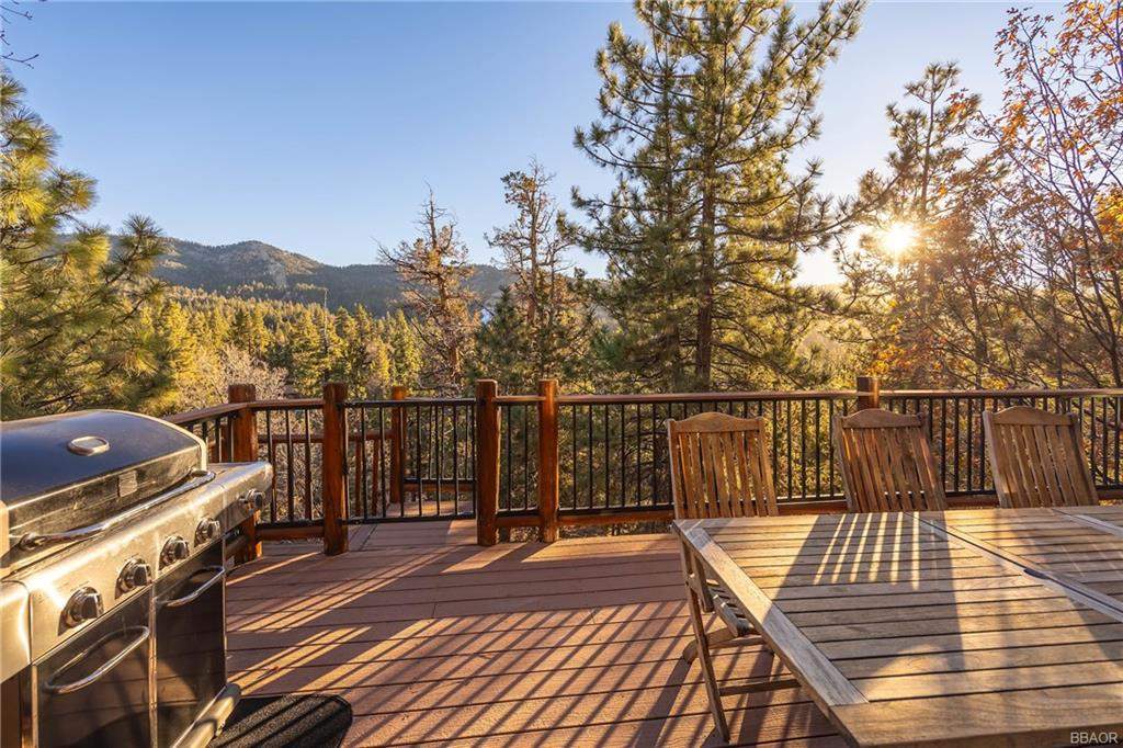 Check out this gorgeous custom log-style home with stunning panoramic views of the ski slopes. Situated in upper Moonridge offering a secluded tree-house feeling, though just minutes from the ski resorts, the lake, dining, and everything else Big Bear has to offer. The open great room floor plan features soaring beamed ceilings and an impressive wall of windows affording abundant natural light. Expertly equipped gourmet kitchen is outfitted with Viking cooktop range/griddle, double oven, and other high-end appliances. Wraparound island with wood slab and pendant lighting, granite countertops and beautiful custom cabinetry plus additional prep sink make entertaining a breeze. Enjoy outdoor living out on the multi level decks, take in views of Bear Mountain and the surrounding ridgeline. Soak in the spa under the stars after a long day on the slopes. Plenty of living space for the whole gang with 4 bedrooms, 3 baths, plus a loft and a bonus/game room. Master suite has access to lower level deck, walk-in closet, master bath has luxurious jetted tub, large glass surround shower, and dual vanities. Separate laundry room with tile counter tops and many cupboards. Property offers easy all-season access, level entry and parking with a street-level 2-car attached garage. This property has all the makings of a dream mountain getaway and/or successful vacation rental investment property.